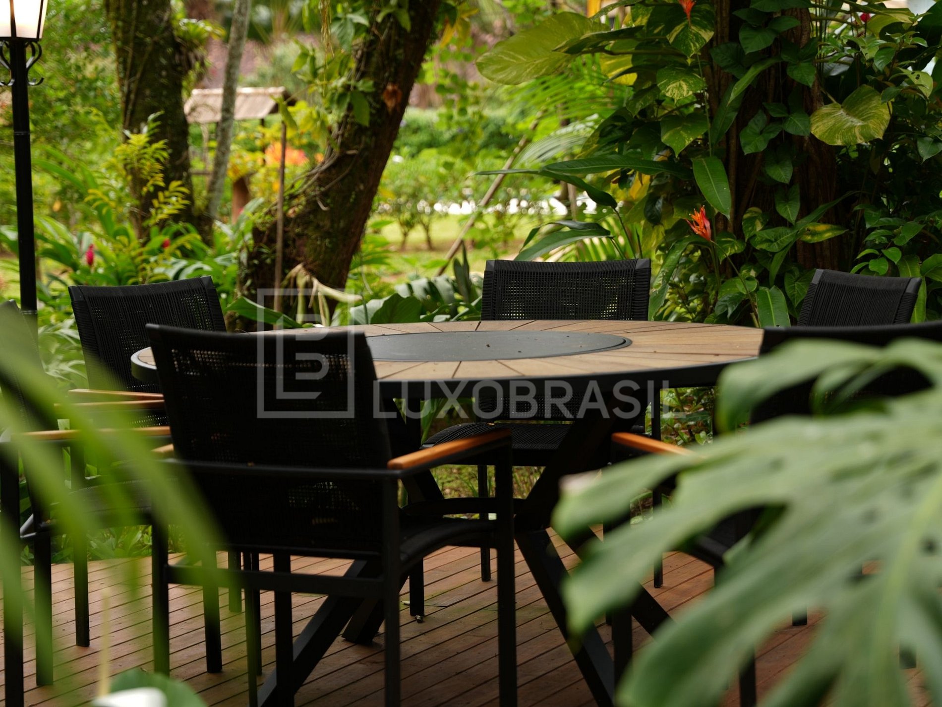 El espacio gourmet es un verdadero destaque, con barbacoa, parrilla y cocina industrial, creando el ambiente ideal para momentos de ocio. La vista a la piscina climatizada y al exuberante jardín completa el entorno, ofreciendo el escenario perfecto para relajarse y disfrutar.