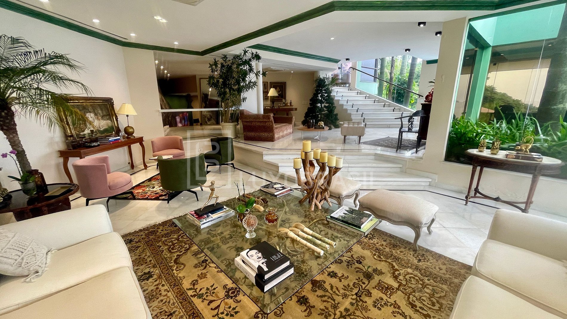 Villa con 3400m² de área total y 1200m² de área construida. Compuesto por un gran salón con 04 habitaciones, balcón con vistas al mar y montaña, 05 suites (01 principal con 02 vestidores), bañera de hidromasaje, 08 baños, cocina con armarios, pista polideportiva, zona de barbacoa, zona gourmet, piscina, jacuzzi, sauna y 06 plazas de aparcamiento.