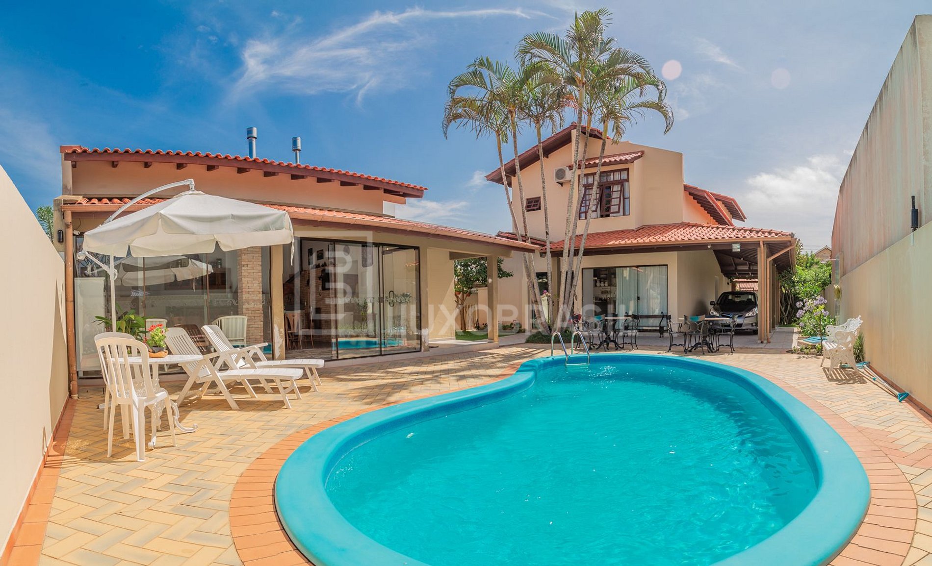 A área de lazer oferece uma estrutura completa com piscina, churrasqueira e forno de pizza. A casa está equipada com 5 unidades de ar condicionado, garagem, internet e TV a cabo. Além disso, possui duas suítes, enquanto os outros dois quartos têm banheiros adjacentes (cada quarto possui seu próprio banheiro). Com capacidade para até 10 pessoas, o grande destaque da propriedade é o espaço gourmet, situado separadamente da casa principal, assemelhando-se a um salão de festas. Com suas portas de vidro que se abrem para a piscina, é o lugar perfeito para reunir familiares e amigos.