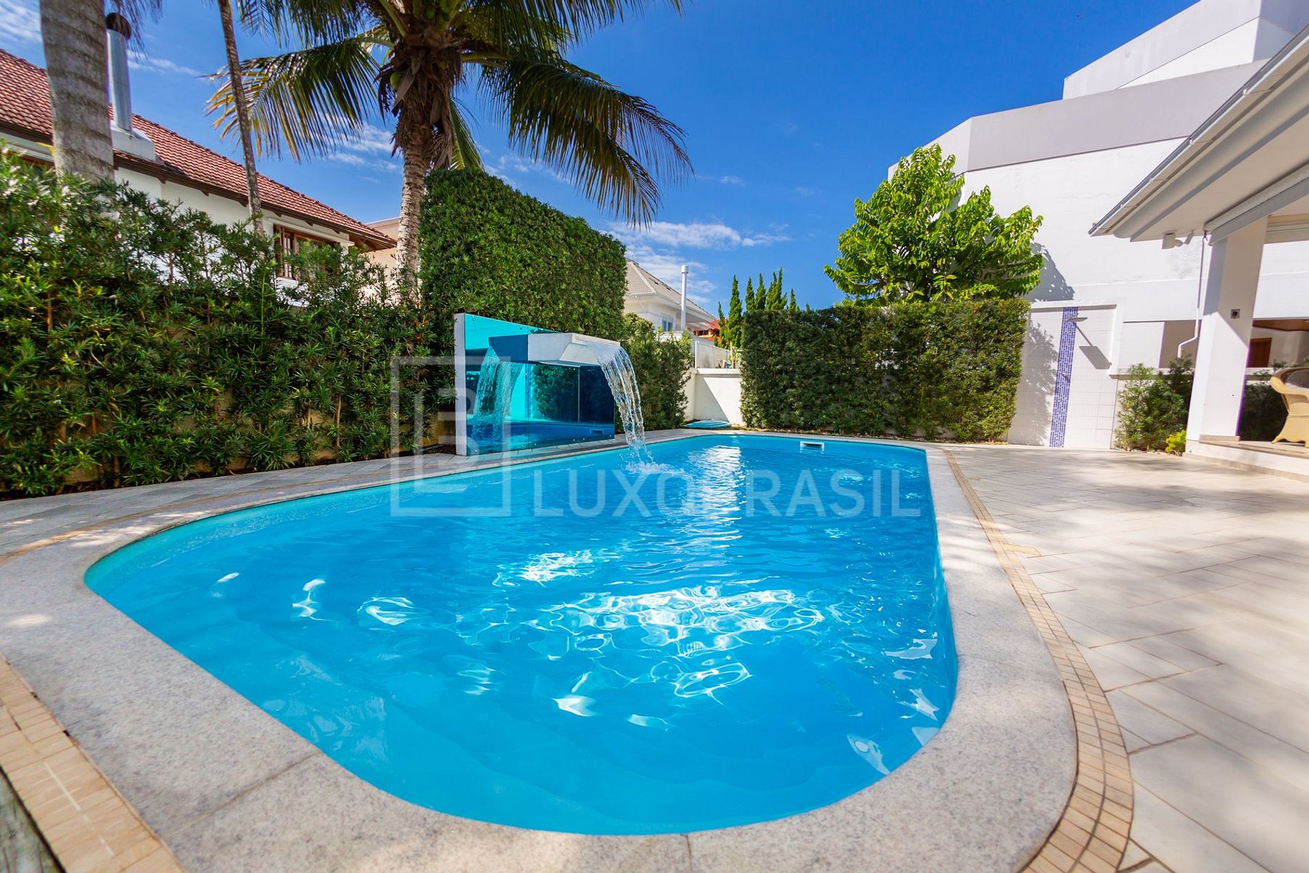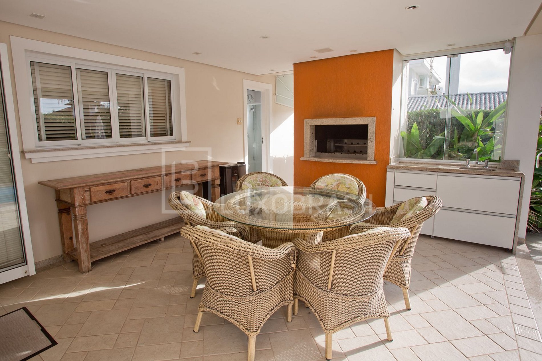 Área de churrasco e lazer integrada com a piscina em um ambiente único e convidativo para aqueles que buscam o melhor dos dias de verão em Jurerê Internacional.