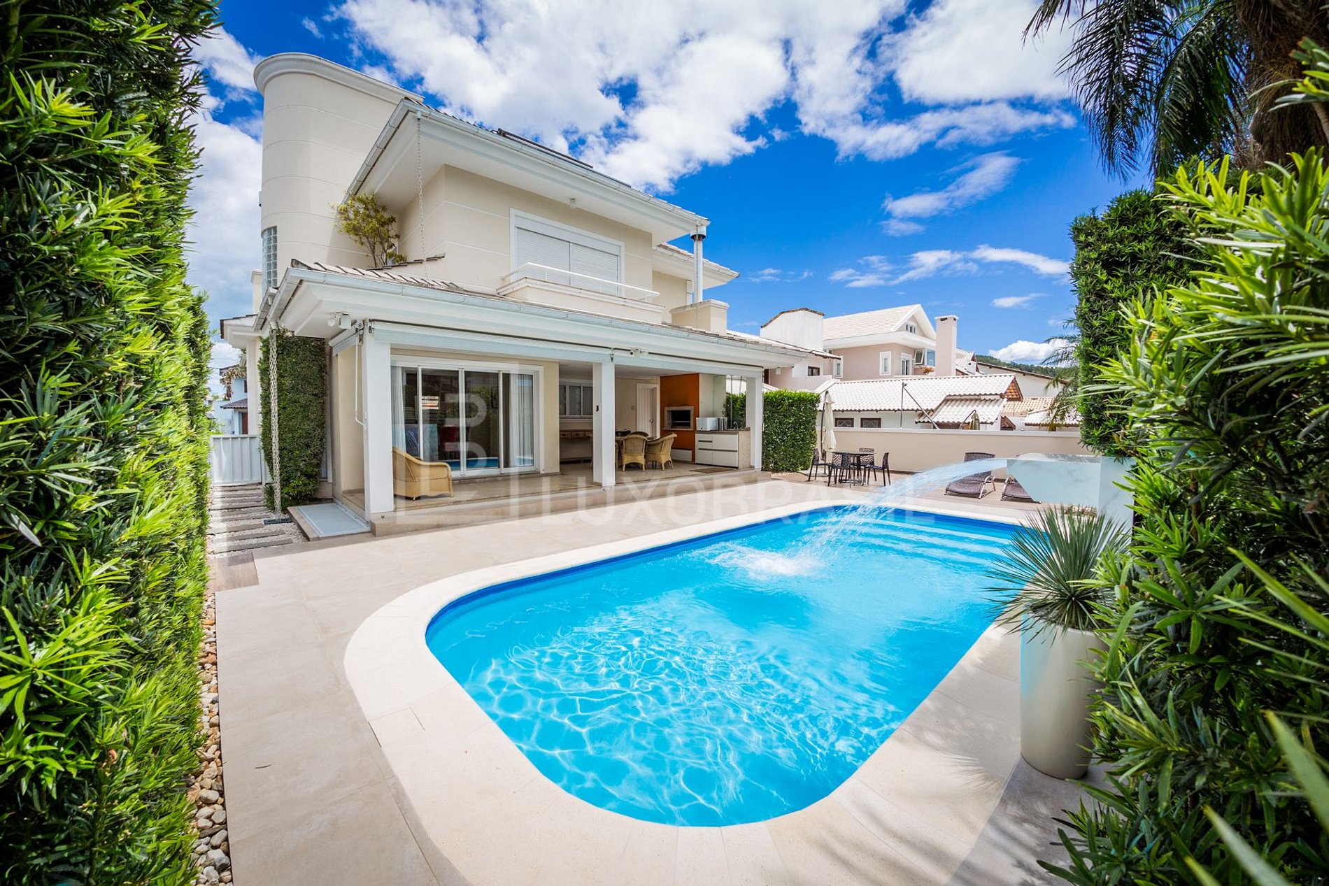 Cada cômodo é preparado com carinho e cada detalhe cuidadosamente pensado para surpreender quem chega. Com design moderno, a casa oferece 5 quartos, 6 banheiros e lavabo, sacadas e uma área de lazer simplesmente perfeita para entretenimento.