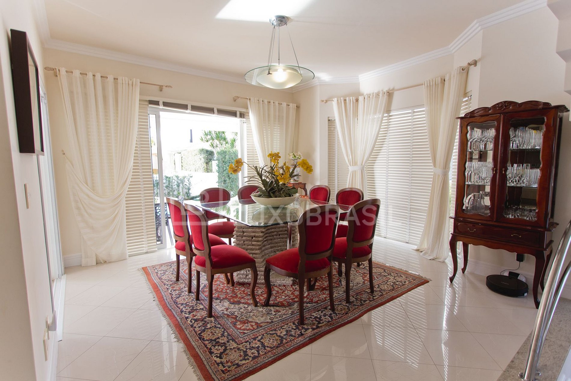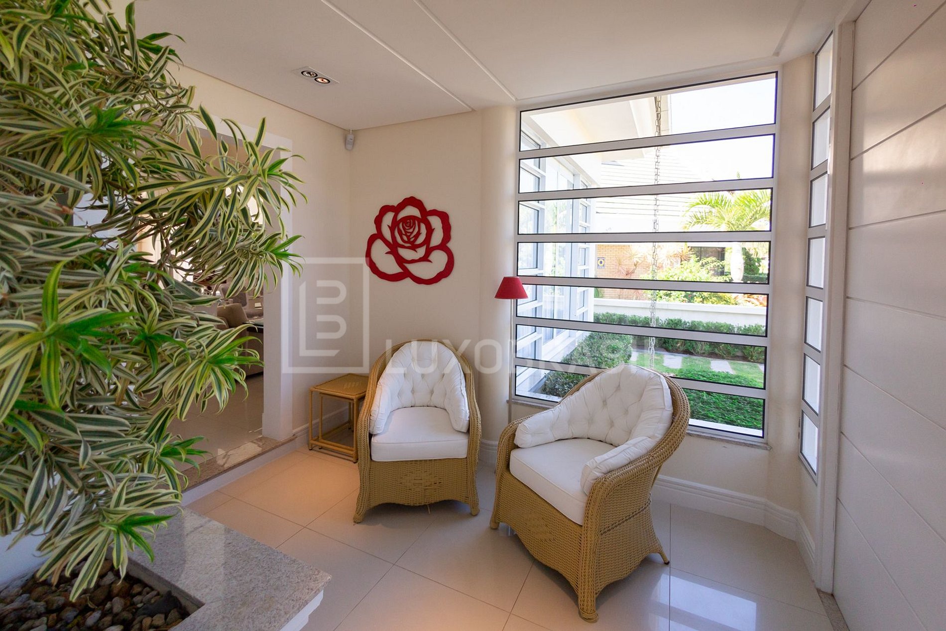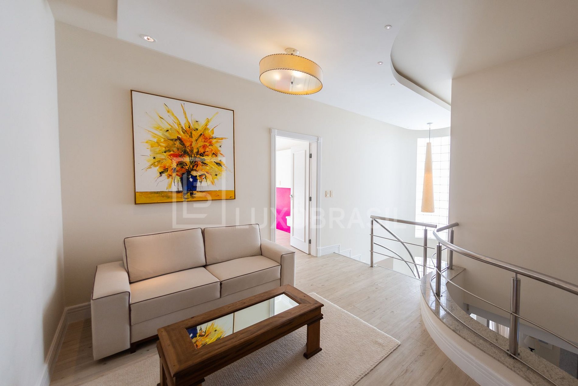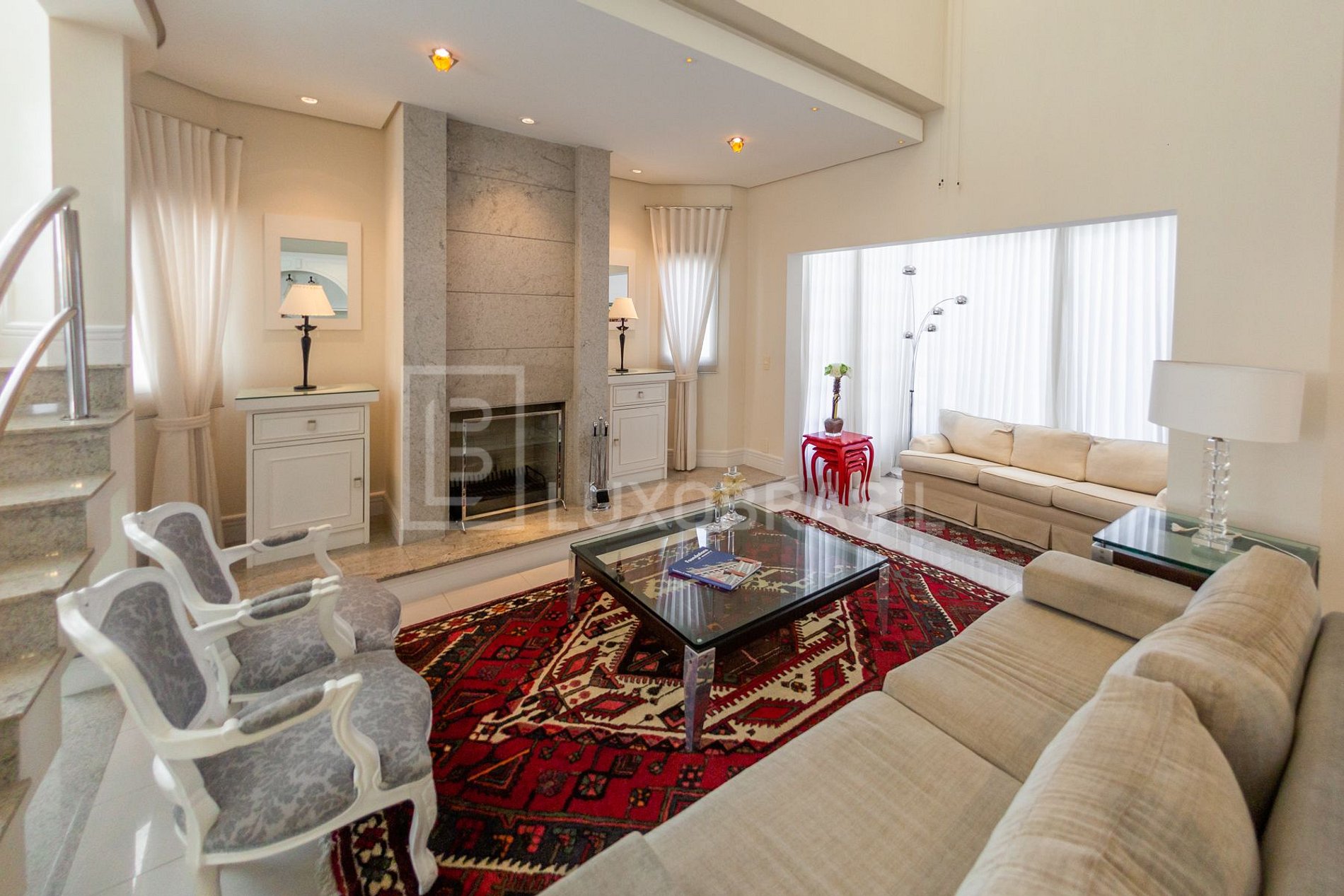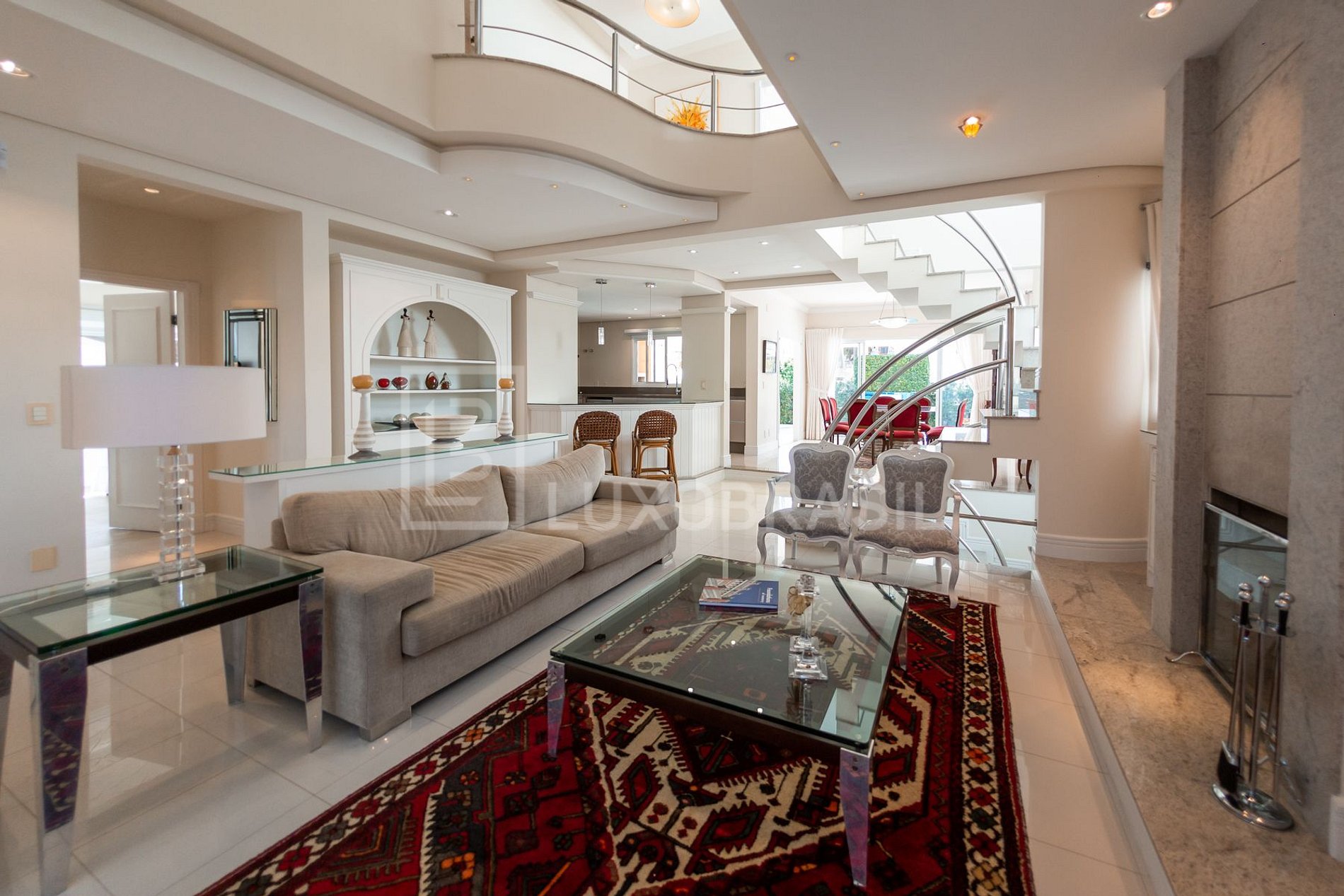 Ao entrar você encontra um belo e iluminado hall de entrada que flui para a sala de estar repleta de conforto, com lareira, sofás e poltronas estrategicamente posicionados para socializar.