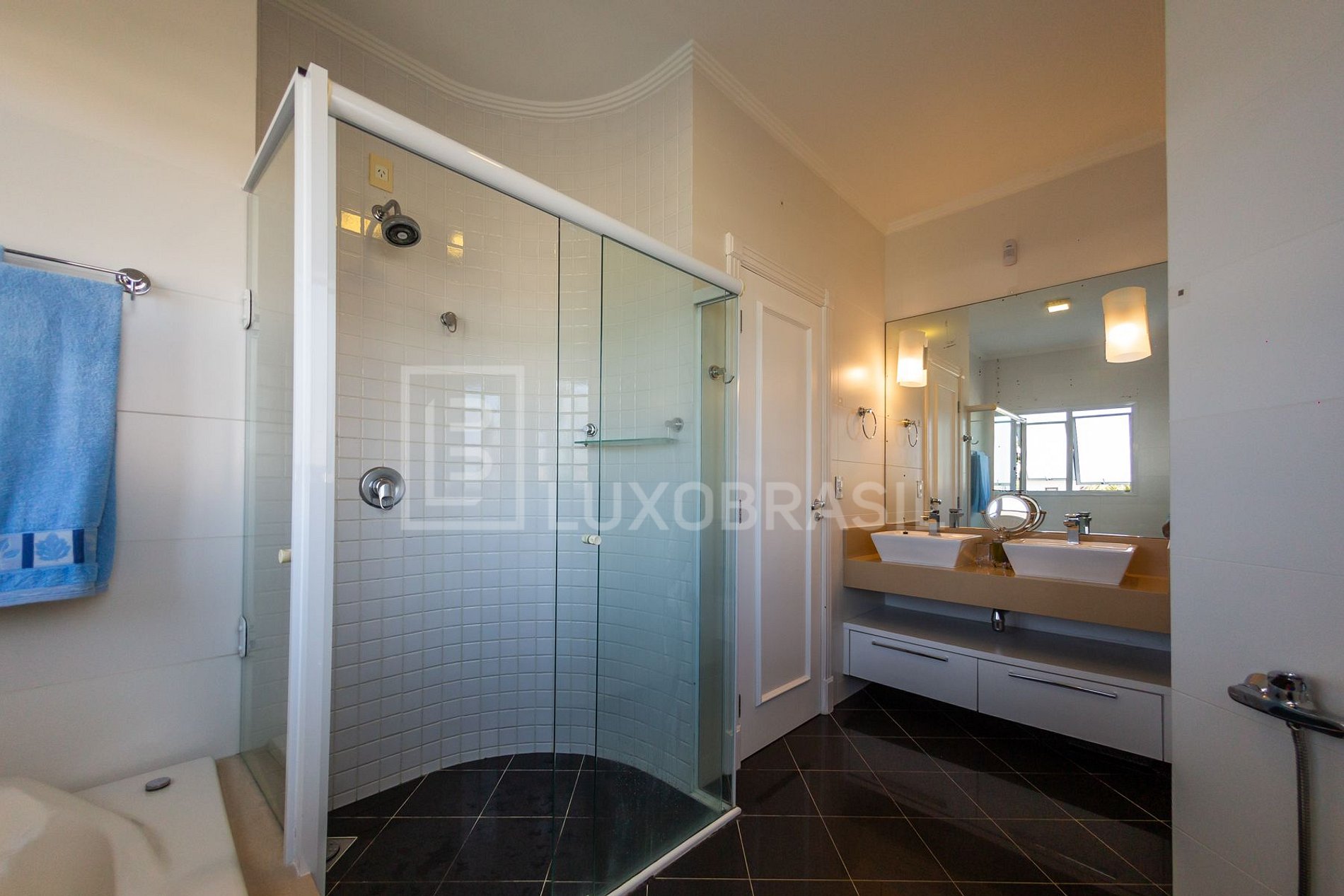 A suíte master possui walk in closet, banheiro com duas pias, banheira e uma bela sacada que permite que a brisa entre facilmente. Há ainda mais uma suíte com sacada e vista para piscina que oferece também um walk-in closet.