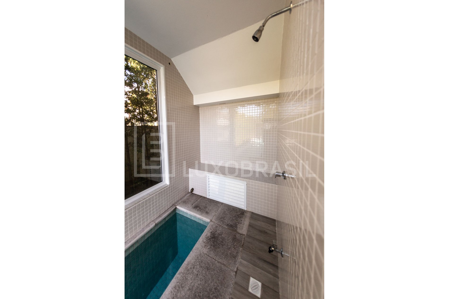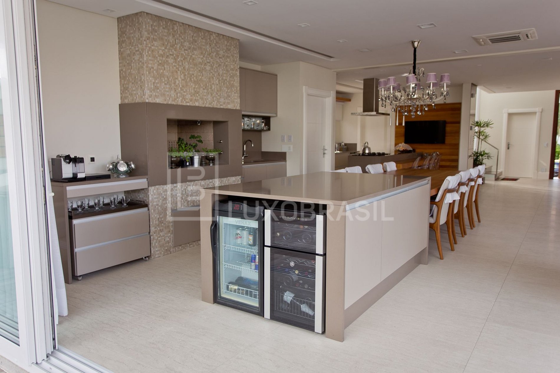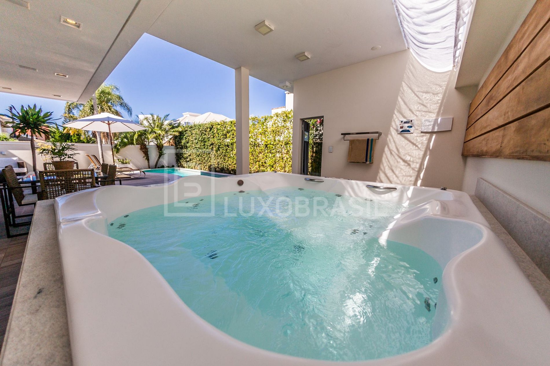 Em um único e extenso ambiente está o living room, sala de jantar e cozinha que fluem com leveza para a extraordinária área de lazer que oferece churrasqueira, jacuzzi para 8 pessoas e piscina com hidromassagem. As espreguiçadeiras, mesas e cadeiras do exterior compõe uma linda sintonia com a piscina e o paisagismo da casa.