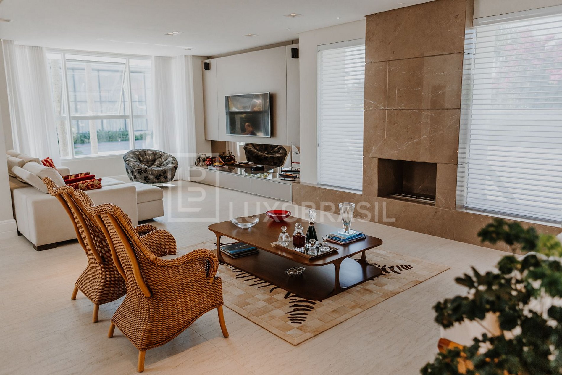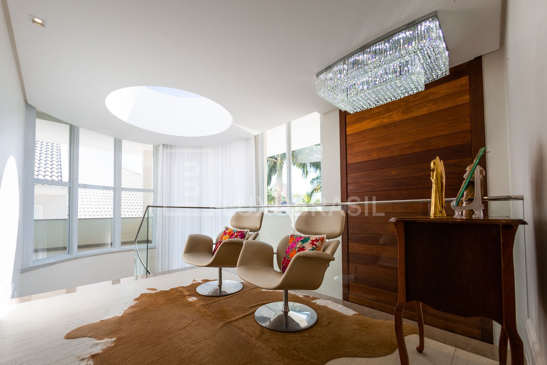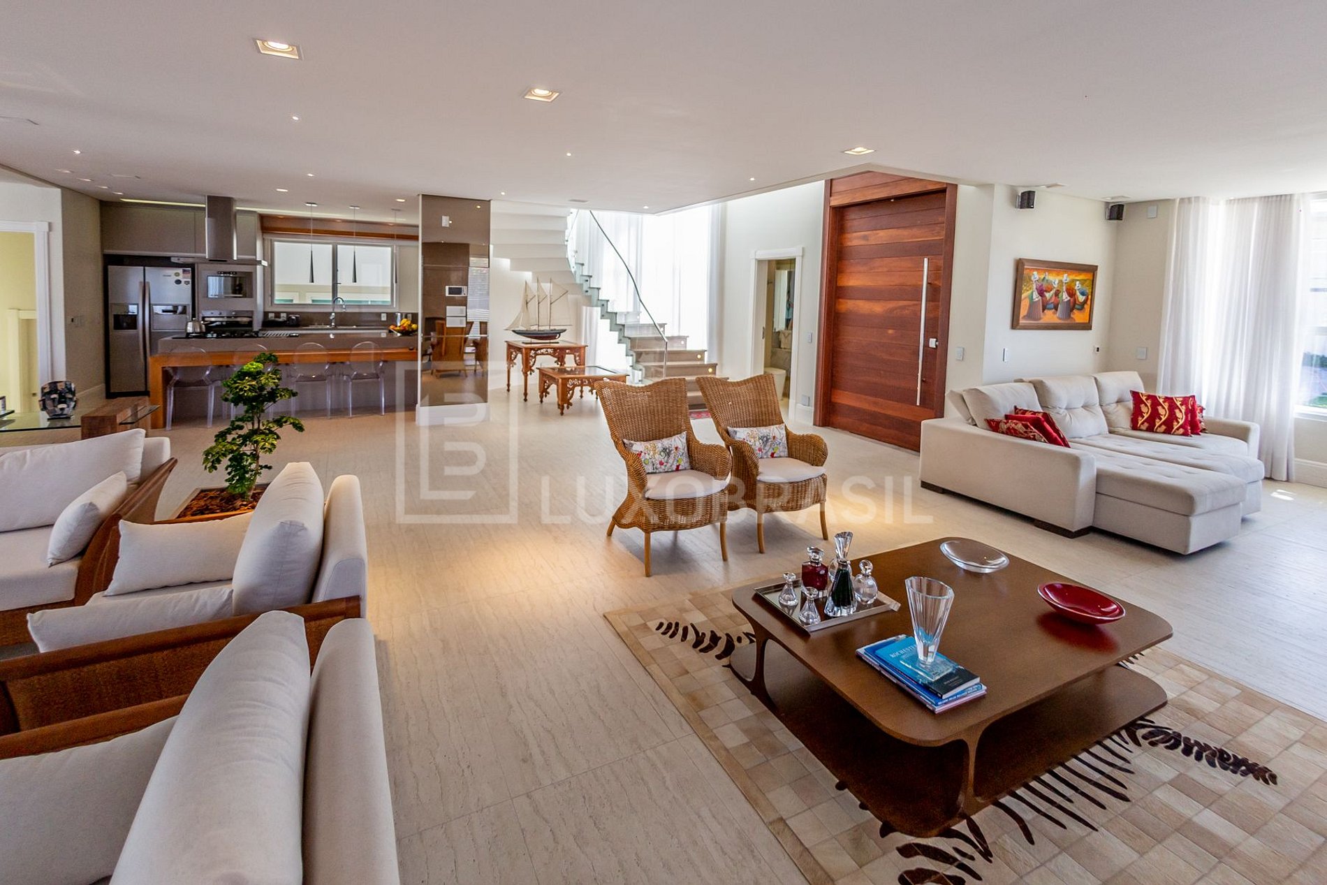 O pé direito duplo do piso térreo, as amplas janelas e portas de vidro de correr propiciam amplitude e muito conforto. As quatro suítes ficam no piso superior, todas aconchegantes, com TV e bem decoradas.