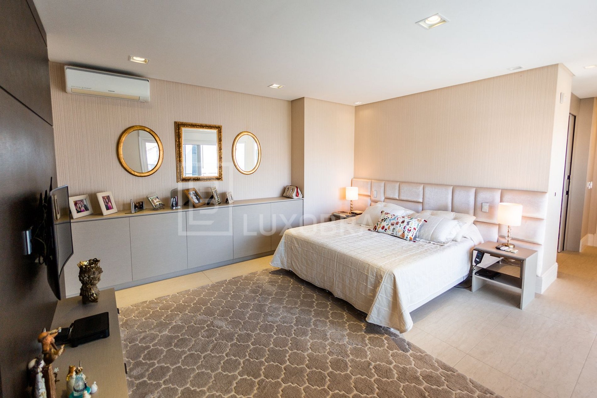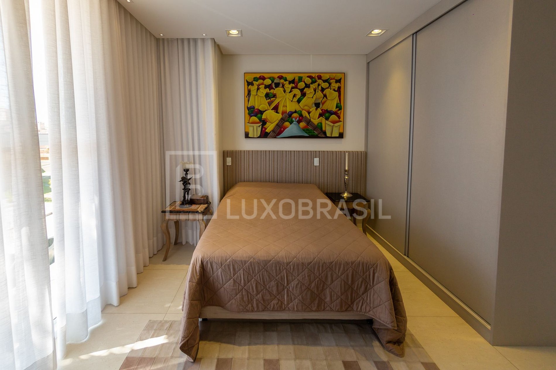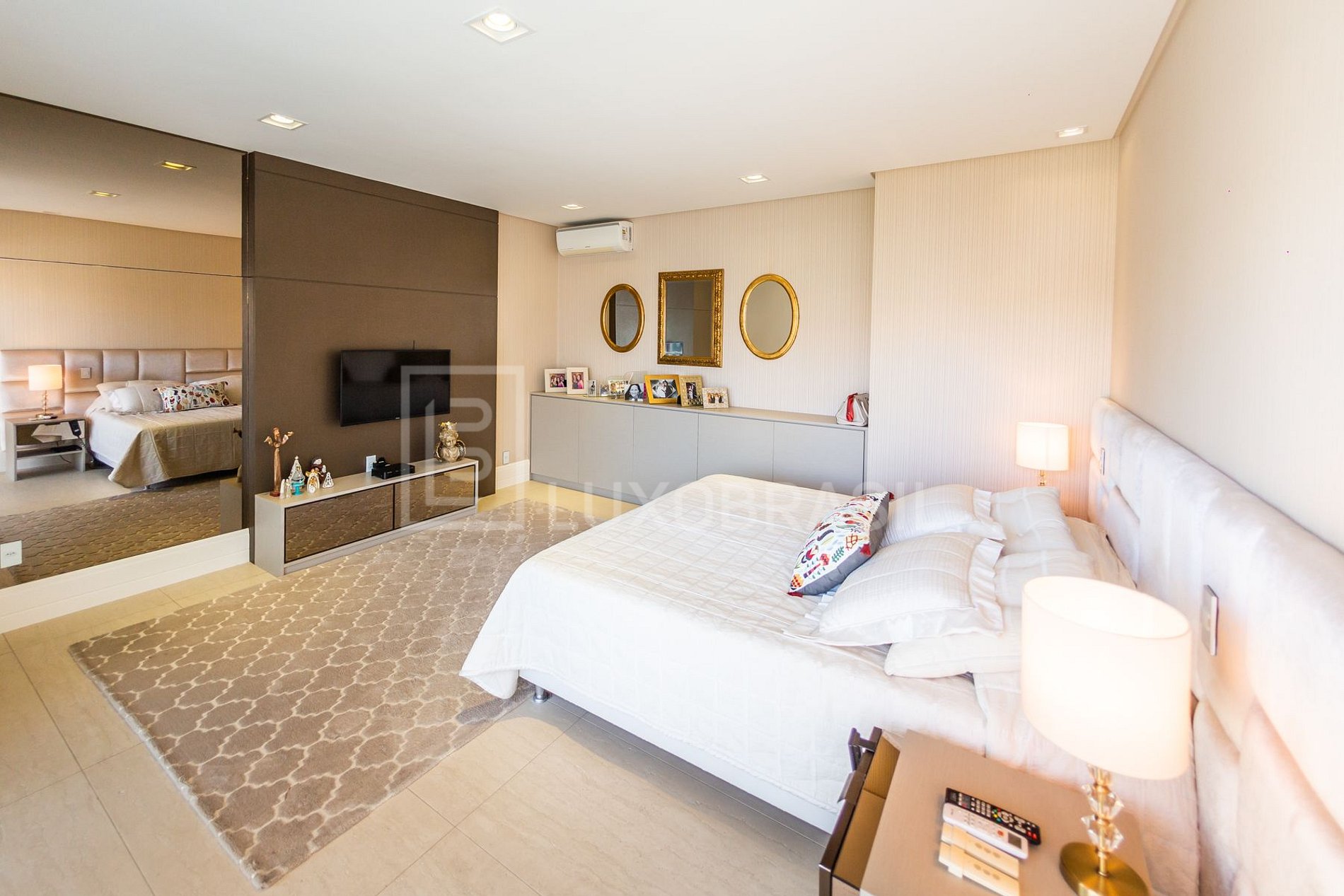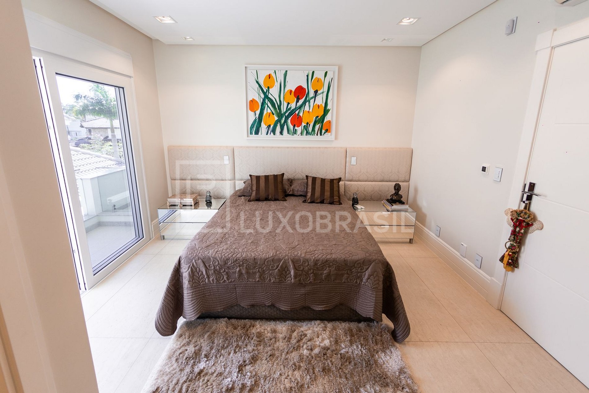 O pé direito duplo do piso térreo, as amplas janelas e portas de vidro de correr propiciam amplitude e muito conforto. As quatro suítes ficam no piso superior, todas aconchegantes, com TV e bem decoradas.
