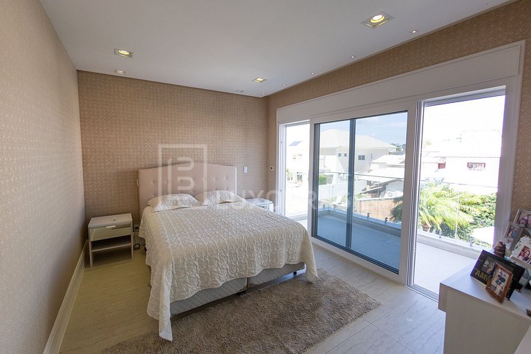 O pé direito duplo do piso térreo, as amplas janelas e portas de vidro de correr propiciam amplitude e muito conforto. As quatro suítes ficam no piso superior, todas aconchegantes, com TV e bem decoradas.