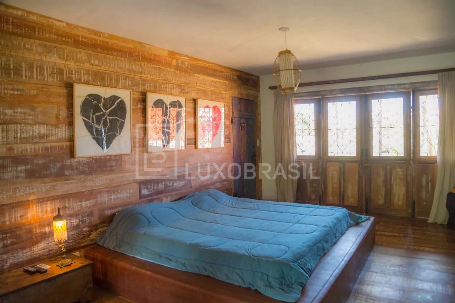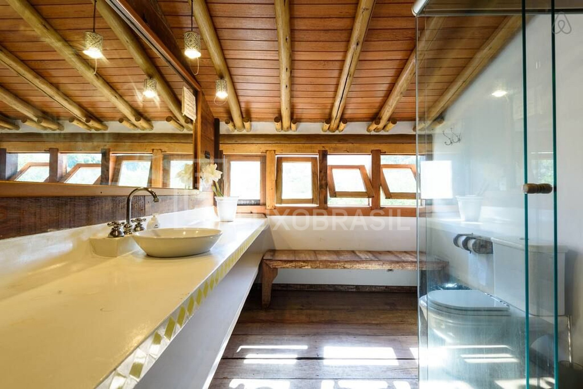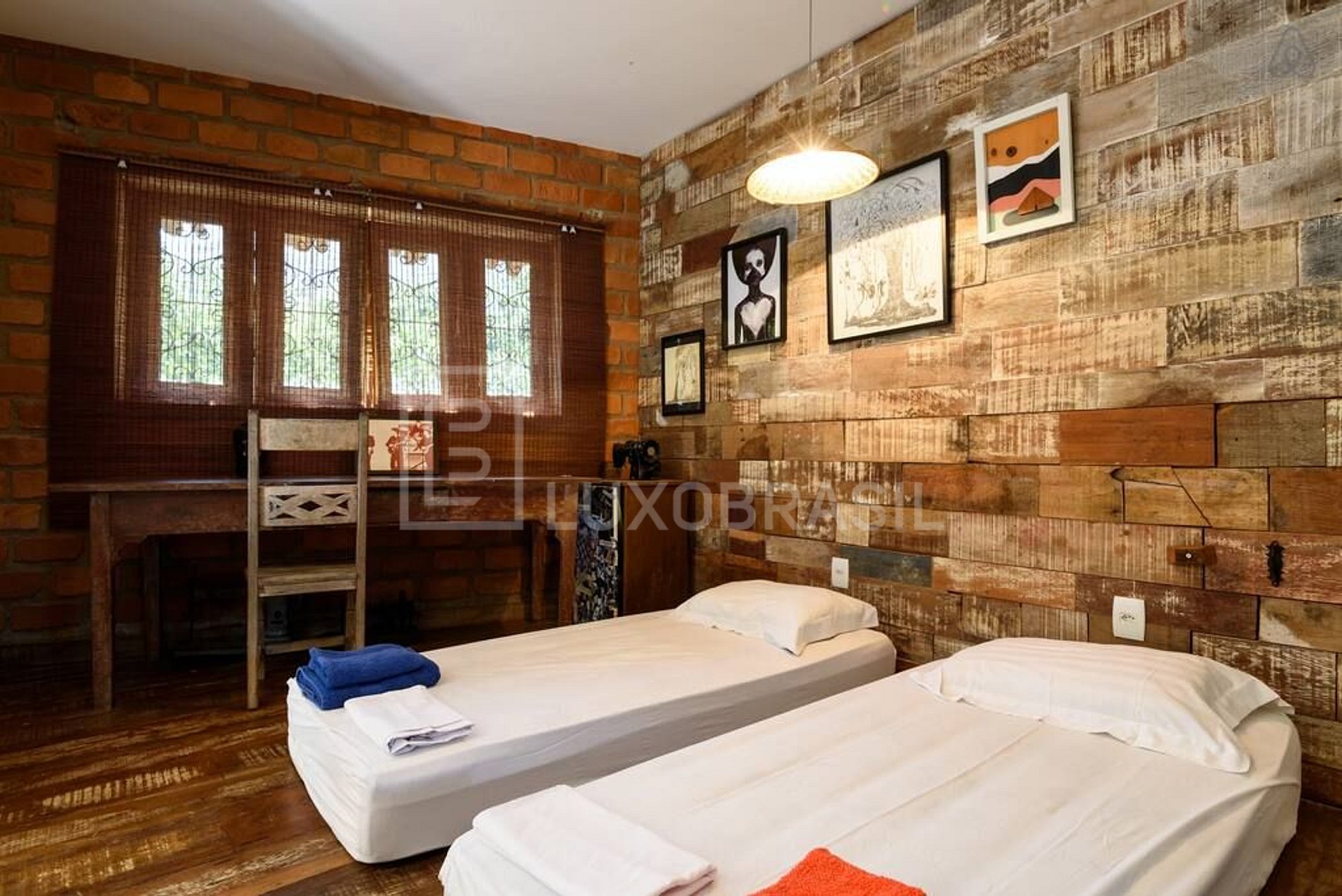 Suíte ampla toda em madeira com mais de 70m². Com vista para Pedra Gávea e Jardim Oceânico. Wi-fi, Split, Cama king size, TV 48”, 6 camas de solteiro e banheiro rústico.