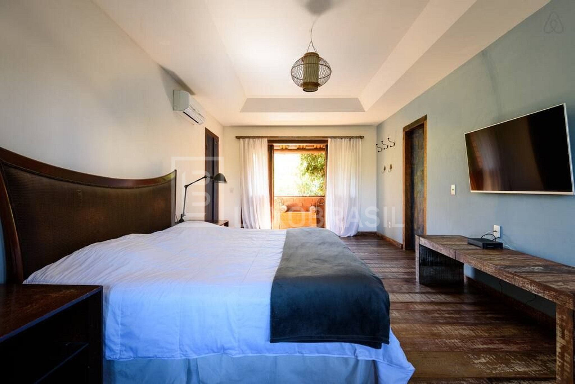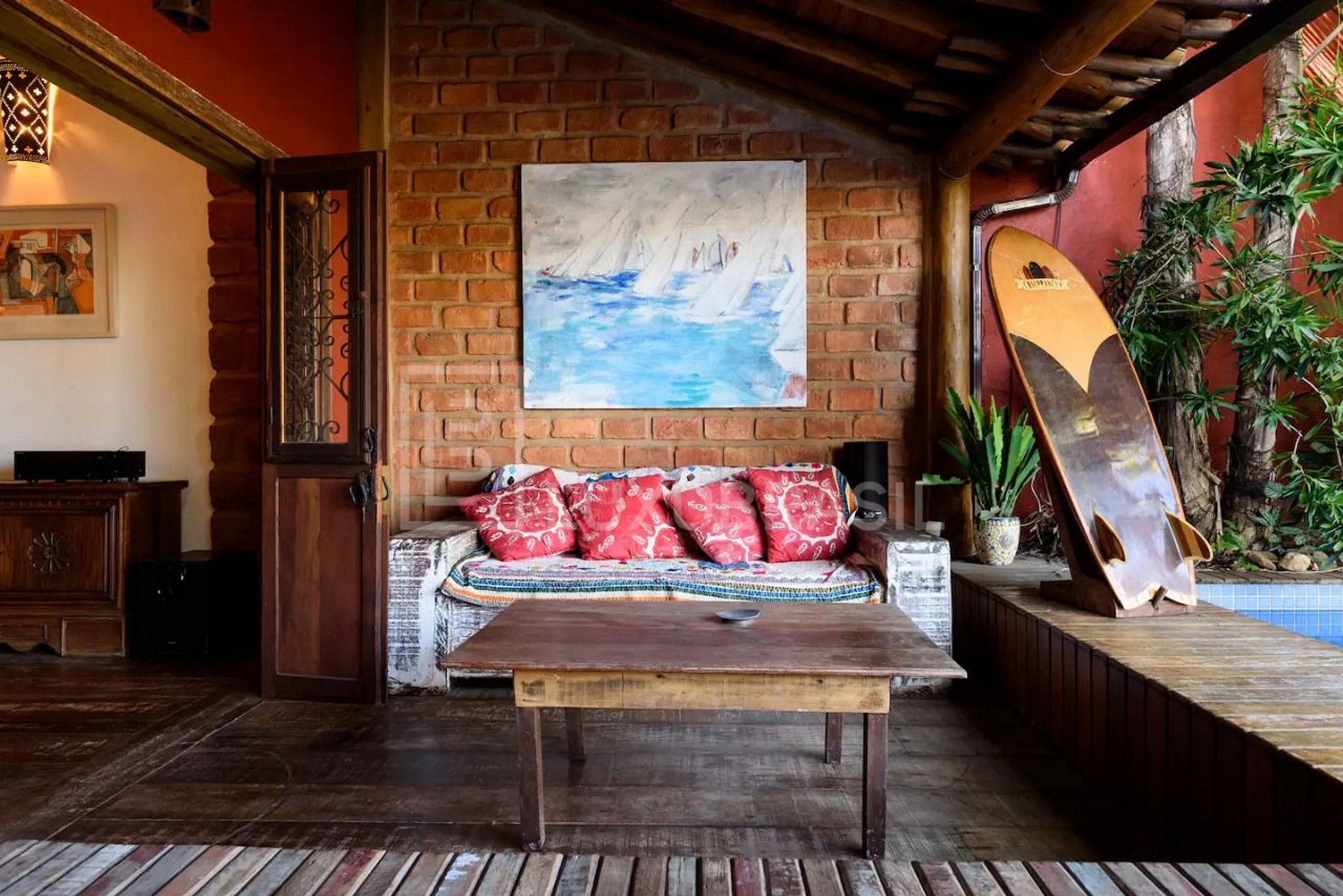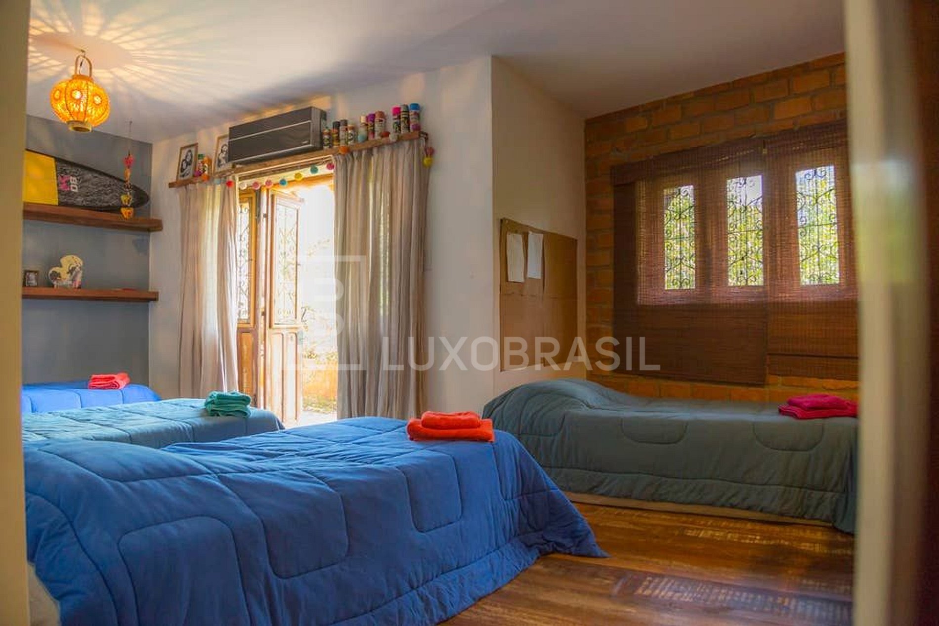 Suíte ampla toda em madeira com mais de 70m². Com vista para Pedra Gávea e Jardim Oceânico. Wi-fi, Split, Cama king size, TV 48”, 6 camas de solteiro e banheiro rústico.