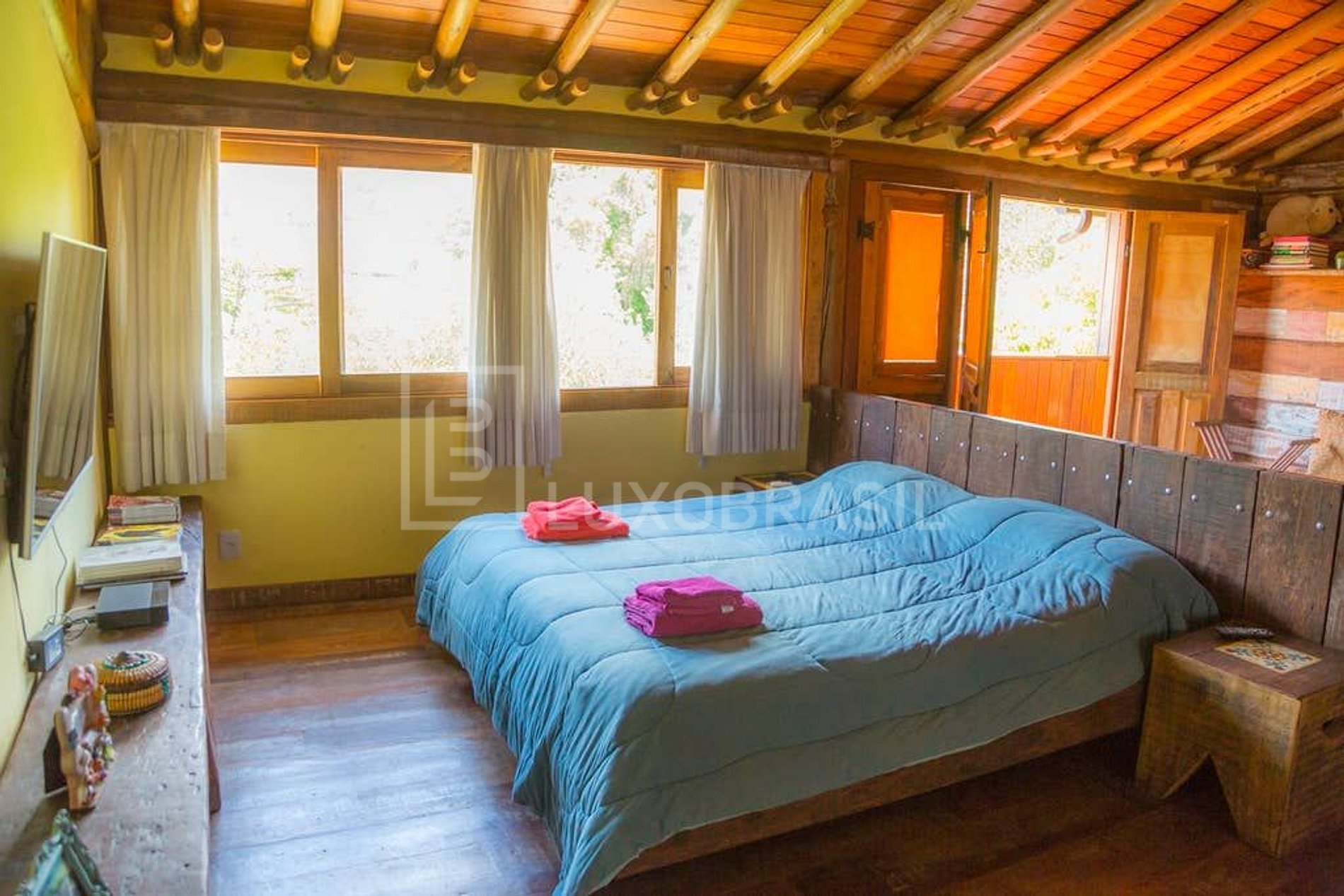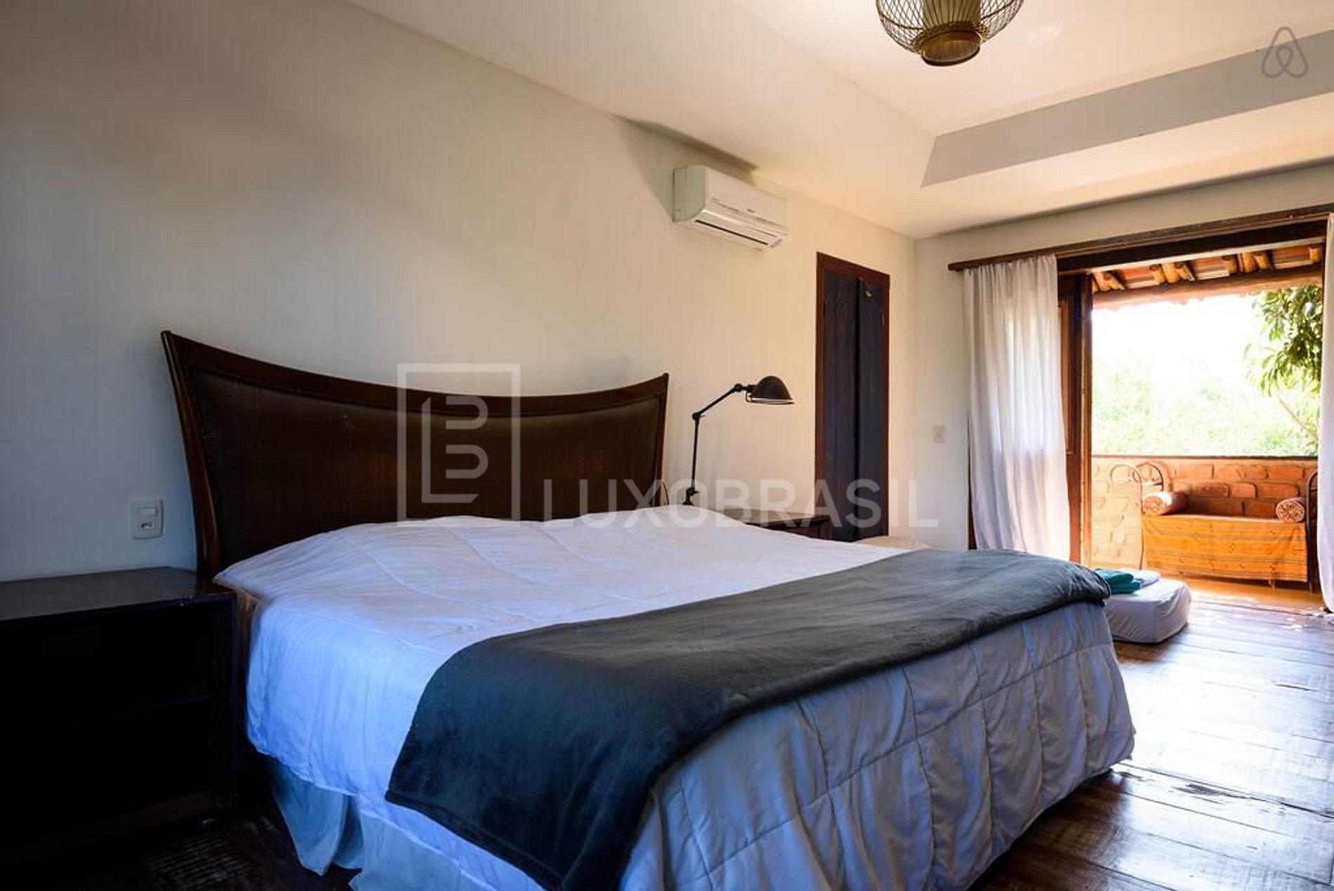 Suíte ampla toda em madeira com mais de 70m². Com vista para Pedra Gávea e Jardim Oceânico. Wi-fi, Split, Cama king size, TV 48”, 6 camas de solteiro e banheiro rústico.