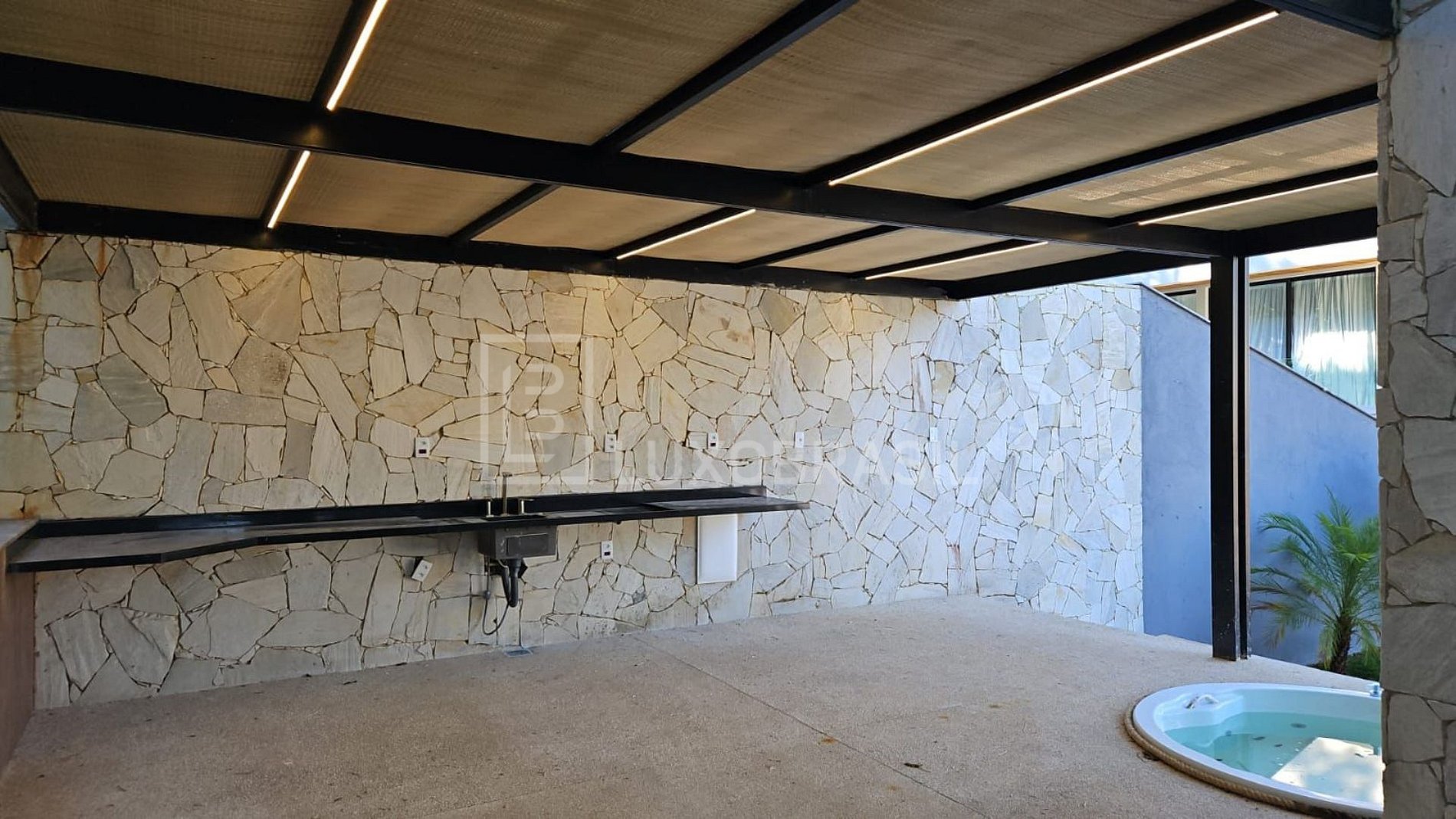 A casa conta ainda com 5 suítes — sendo a Suíte Master com varanda privativa, banheiro espaçoso e previsão para ofurô no deck mirante — além de home cinema, área gourmet completa, vestiários de apoio à piscina e mezanino com copa de apoio.