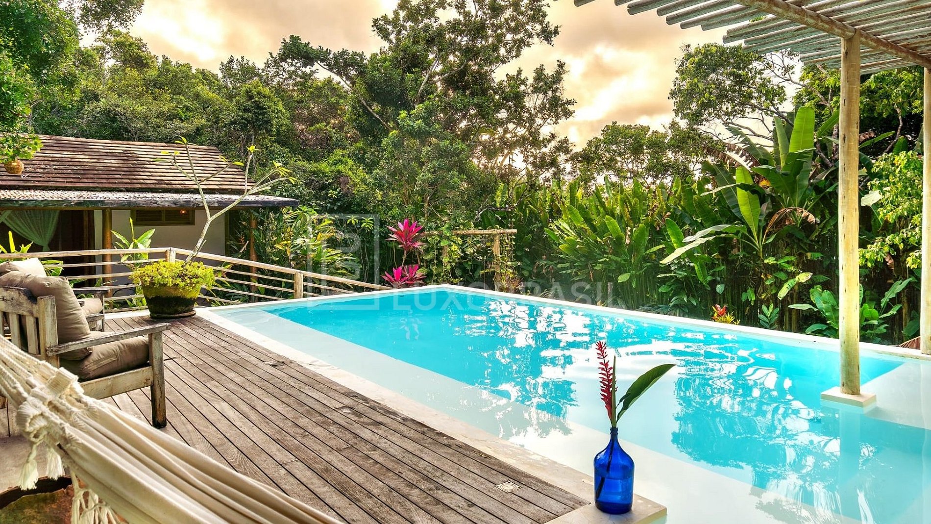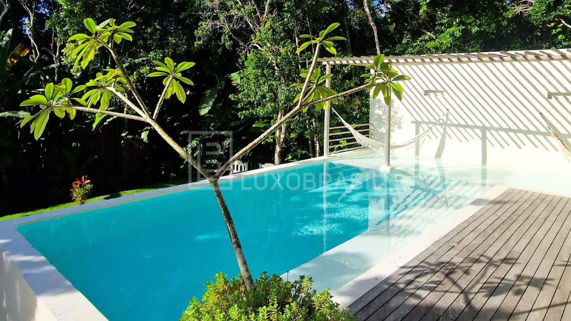 • Piscina com prainha, pergolado, redário e jardim gramado cheio de vida.