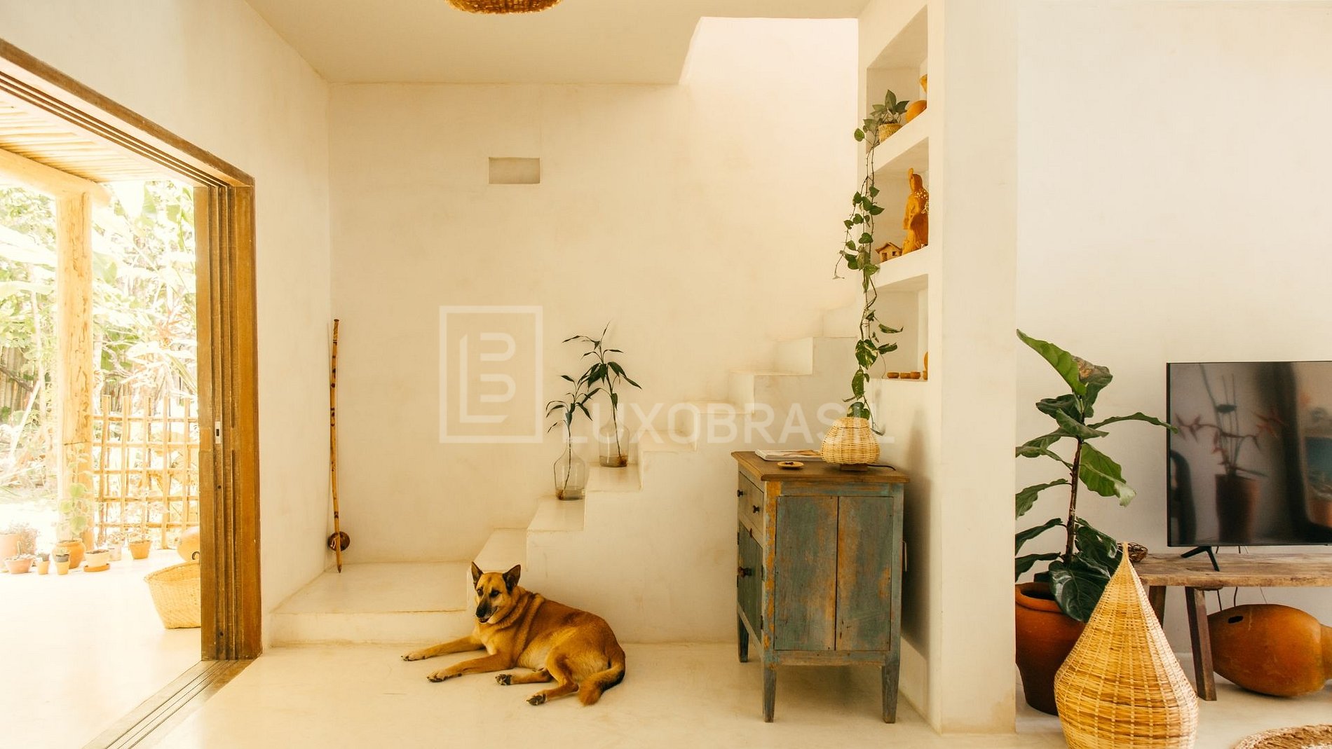 • Decoração boho-chic com materiais naturais e artesanato local.
