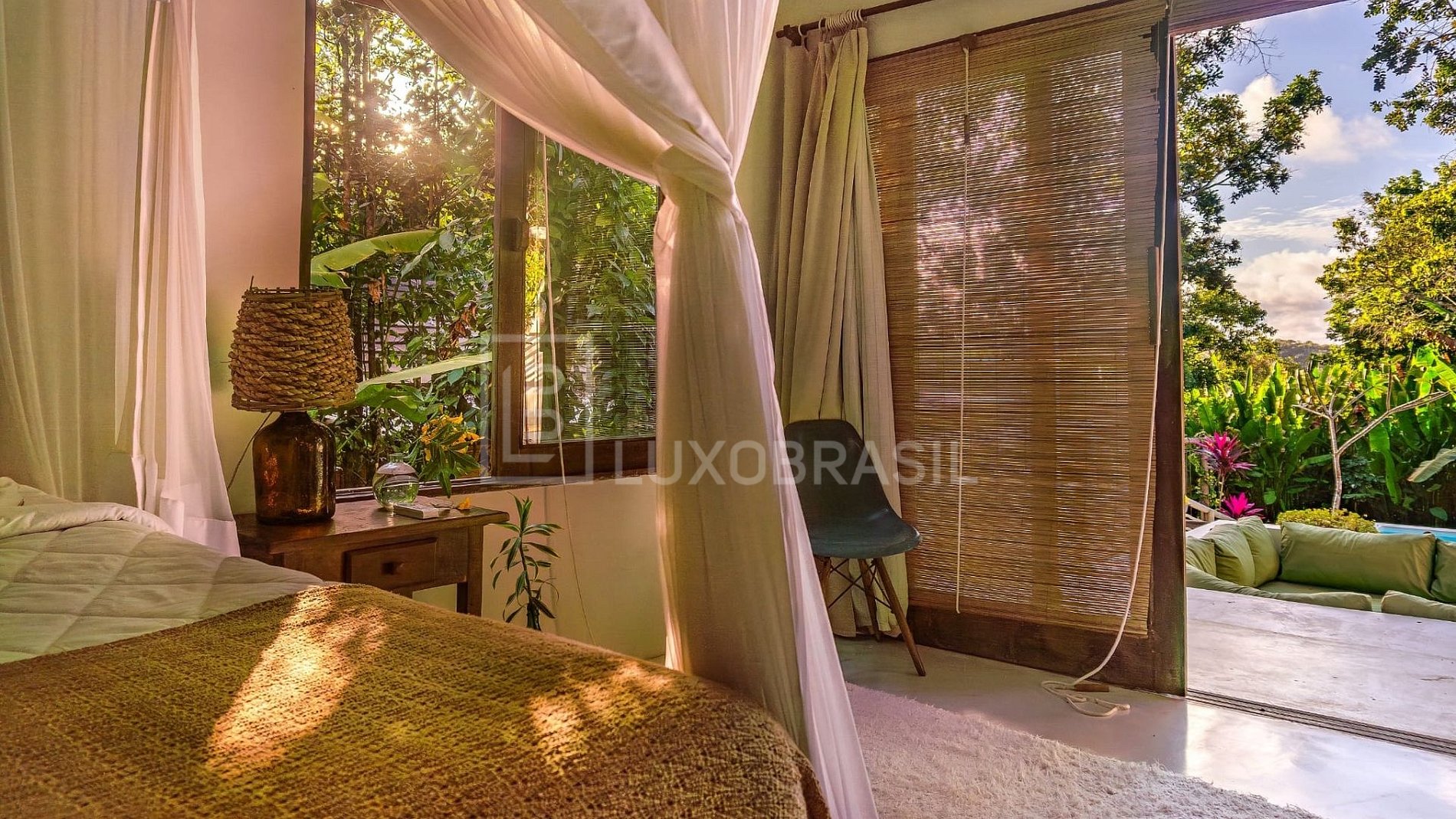Com 5 suítes (3 na casa principal + 2 no bangalô independente), a casa acomoda até 11 hóspedes com muito estilo. Sua arquitetura rústico-minimalista se integra ao verde exuberante, criando um cenário mansinho, acolhedor e inspirador.