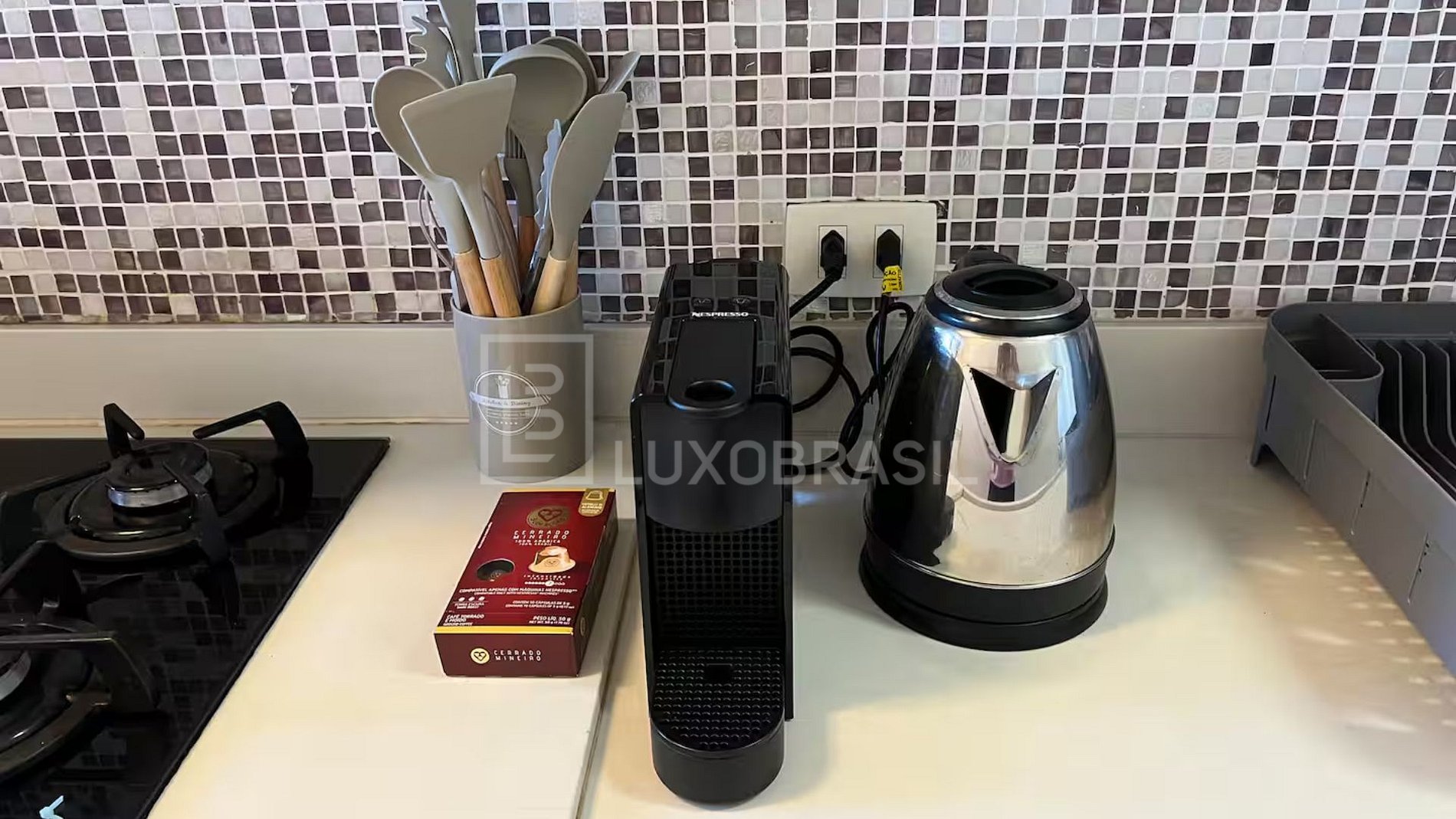 A cozinha é equipada com geladeira, cooktop Brastemp de cinco bocas, micro-ondas, bancada com duas cubas, liquidificador, extrator de sucos, torradeira, sanduicheira, utensílios básicos e lava e seca Samsung, além de pequeno varal.