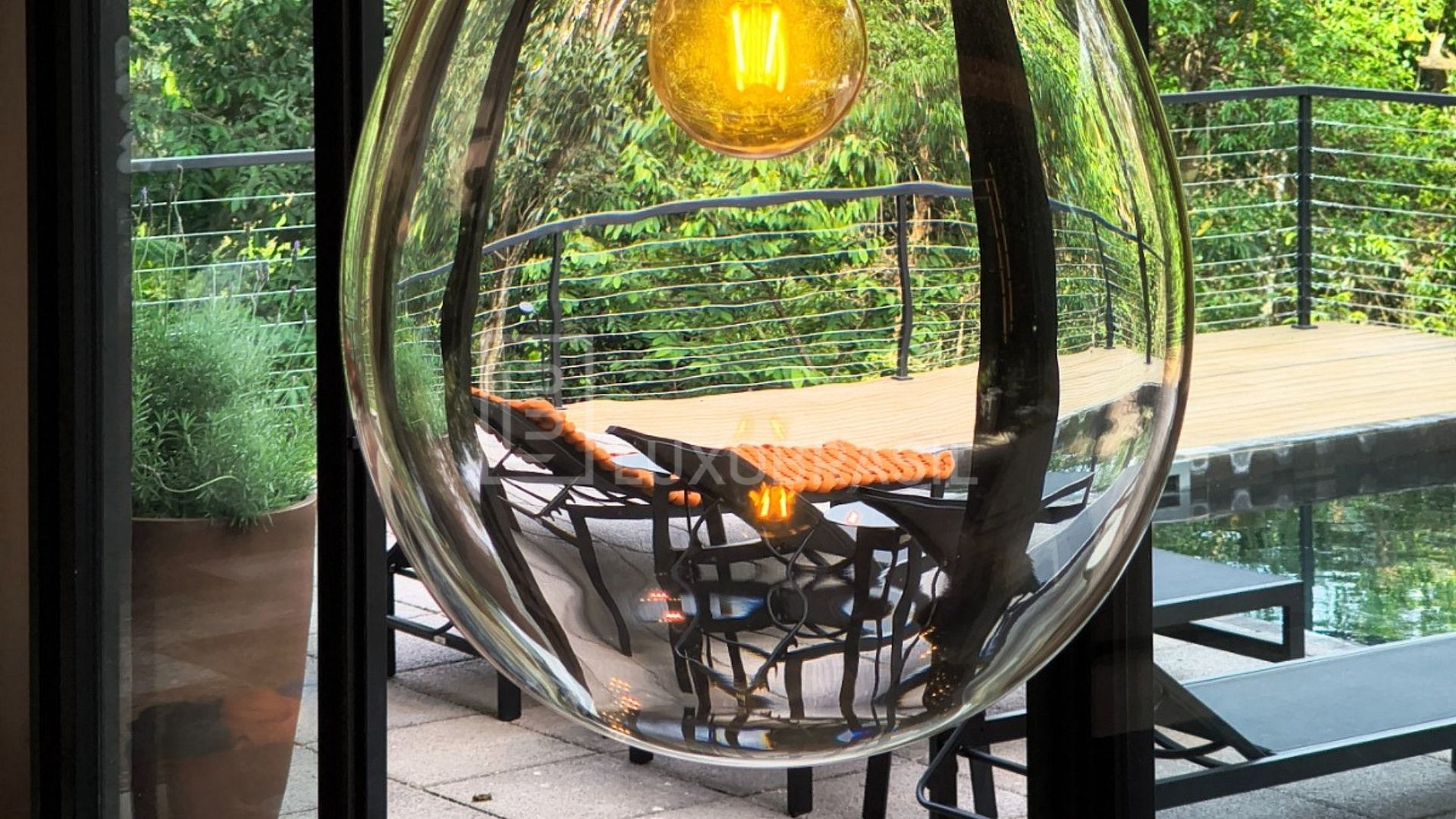 Área externa com piscina e SPA revestidos em pedras vulcânicas Pallimanan