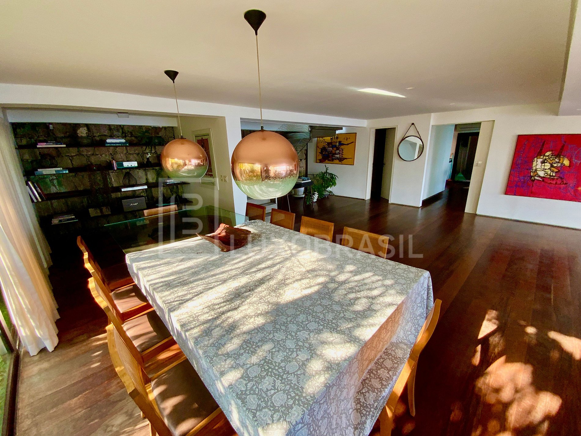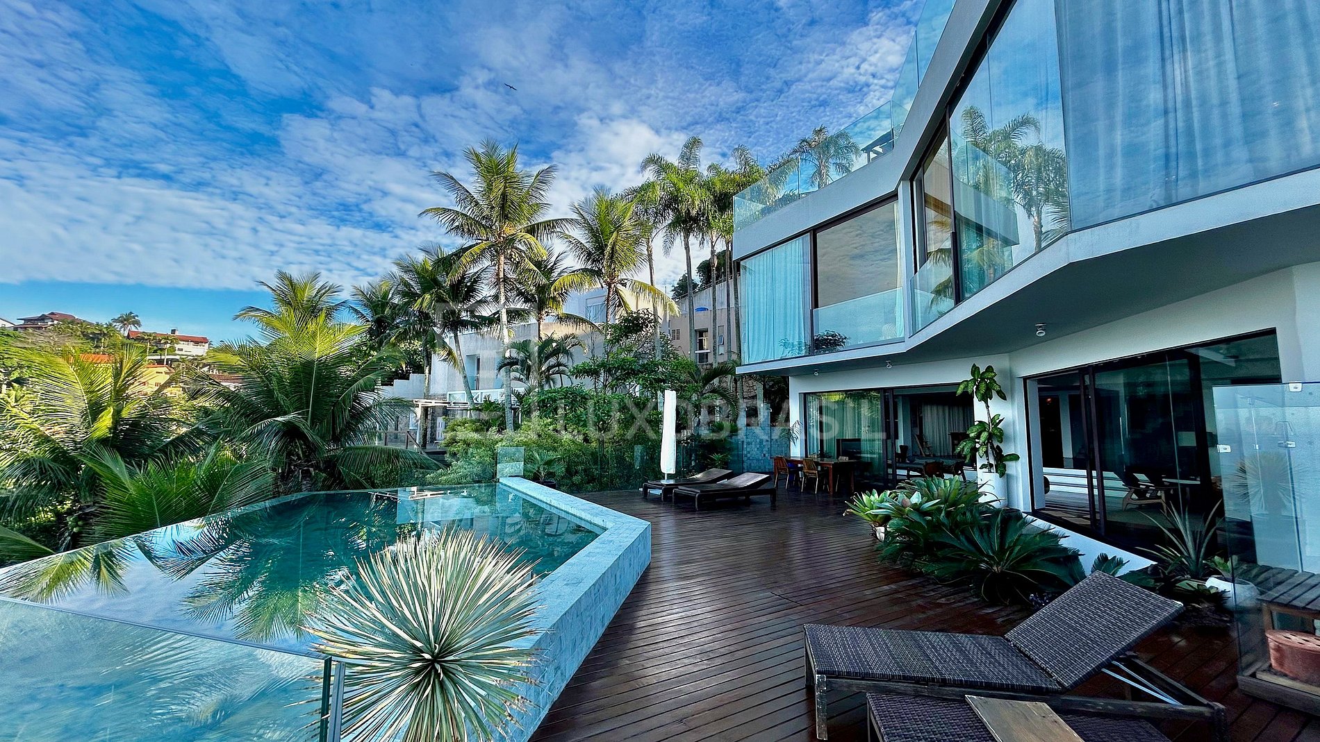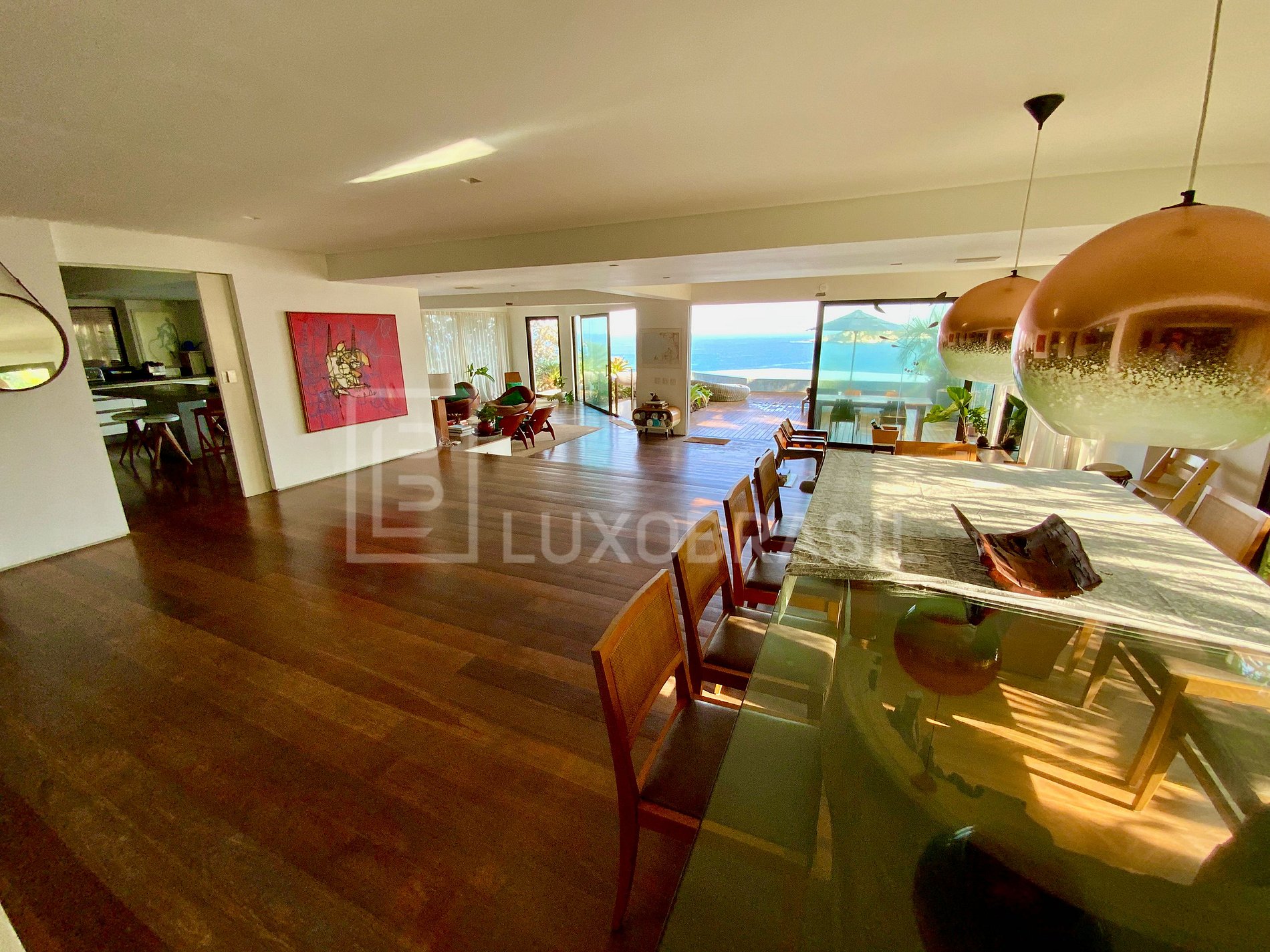 O principal pavimento conta com ampla sala integrada em diferentes ambientes, com sala de jantar, espaço para leitura e sala de estar. Em direção à saída, temos o deck com a linda piscina, espreguiçadeiras e mesa para refeições ao ar livre.