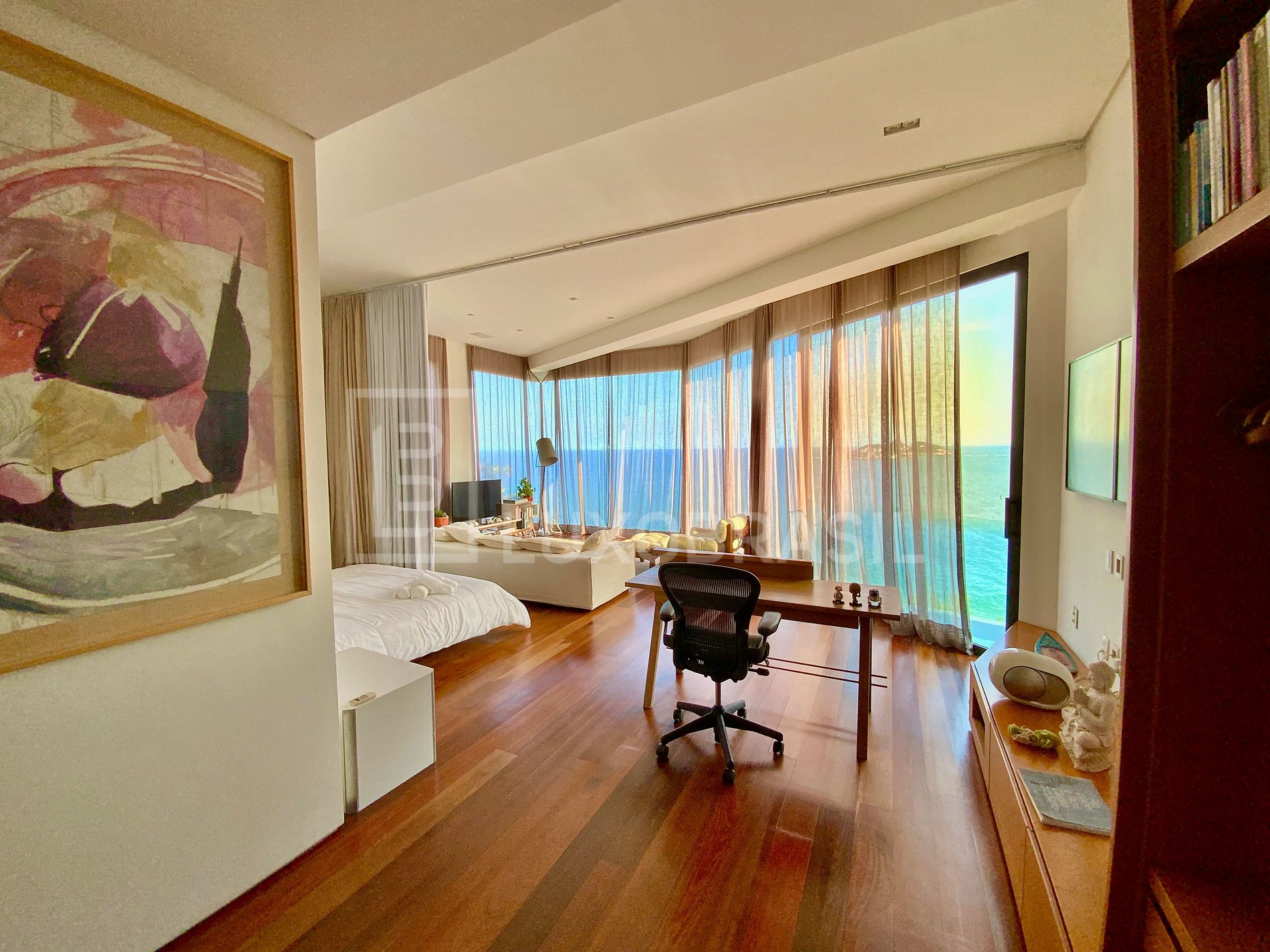 No andar superior encontra-se as 04 principais suítes da casa, sendo 02 com linda vista para o mar e 02 viradas para o jardim. A suíte master possui hidromassagem, uma ante-sala com mesa de escritório e uma vista maravilhosa do mar e da Praia da Joatinga.