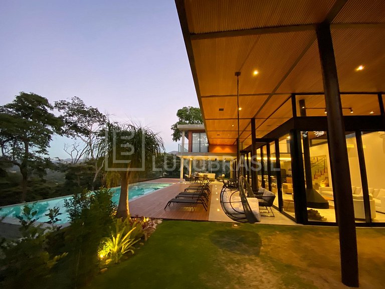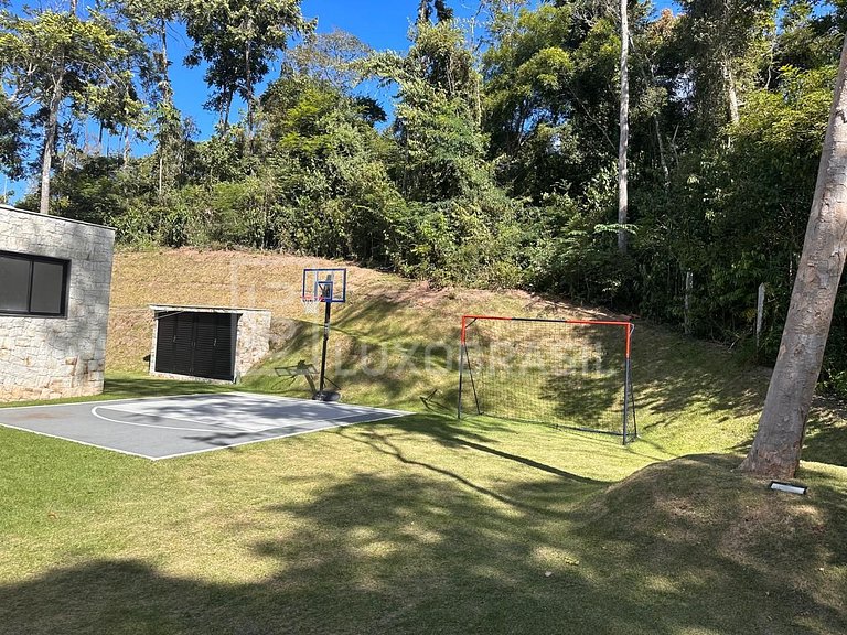 Sala com três ambientes, área gourmet, equipada com churrasqueira. Acomode-se junto à lareira nas noites frias ou dê um mergulho na piscina com borda infinita, curtindo a paisagem incrível ao seu redor. Relaxe na sauna ou divirta-se com uma partida de futebol ou basquete na área de lazer.