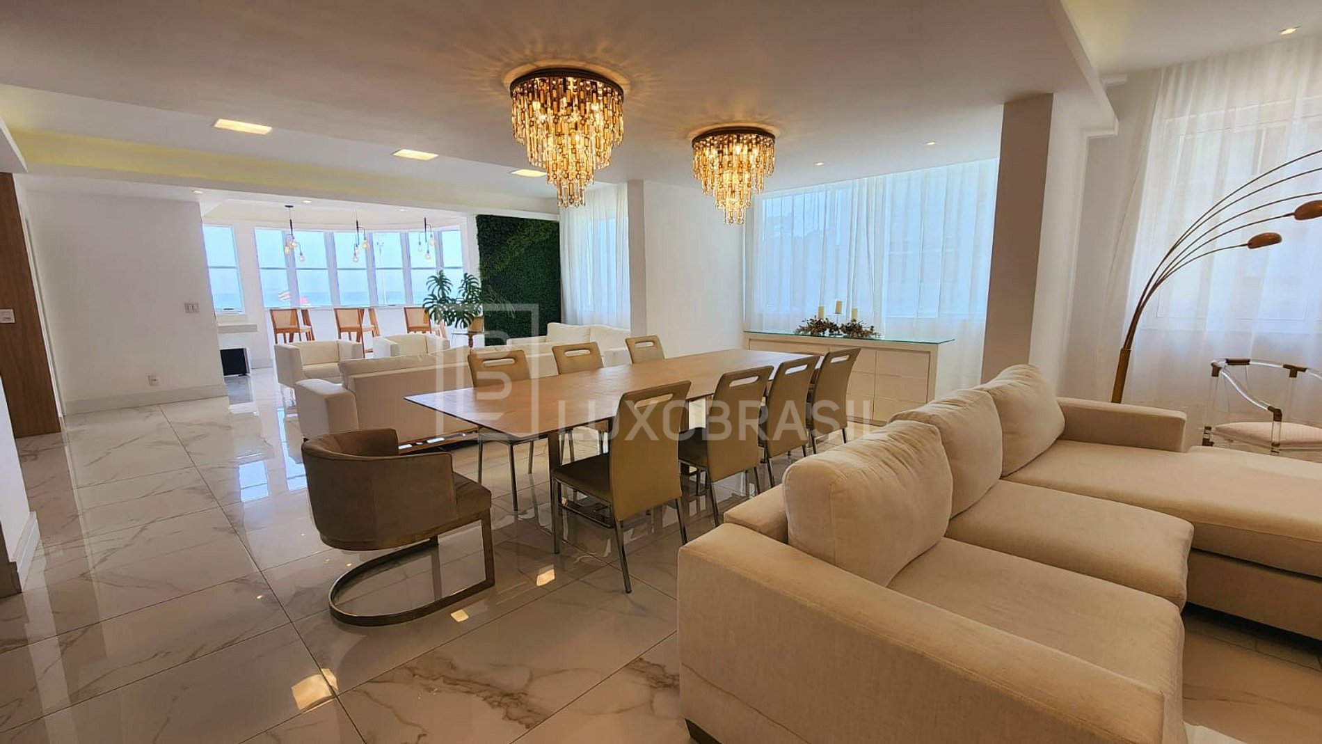 Espaçosa sala dividida em sala de estar, varanda com vista mar, sala de tv e sala de jantar integrada a cozinha toda equipada.