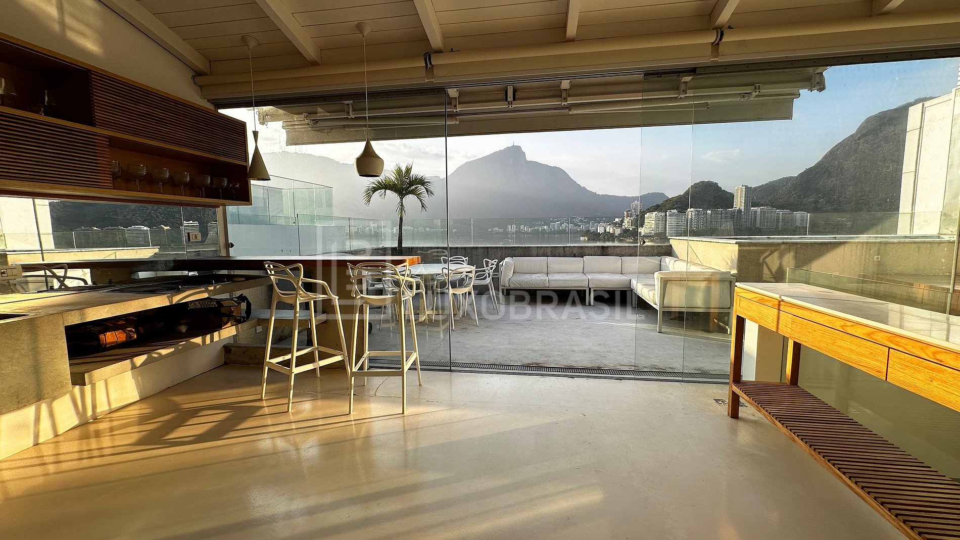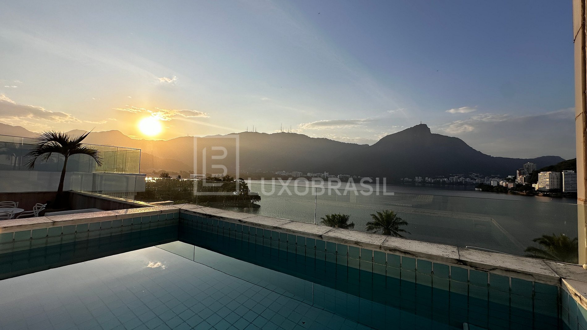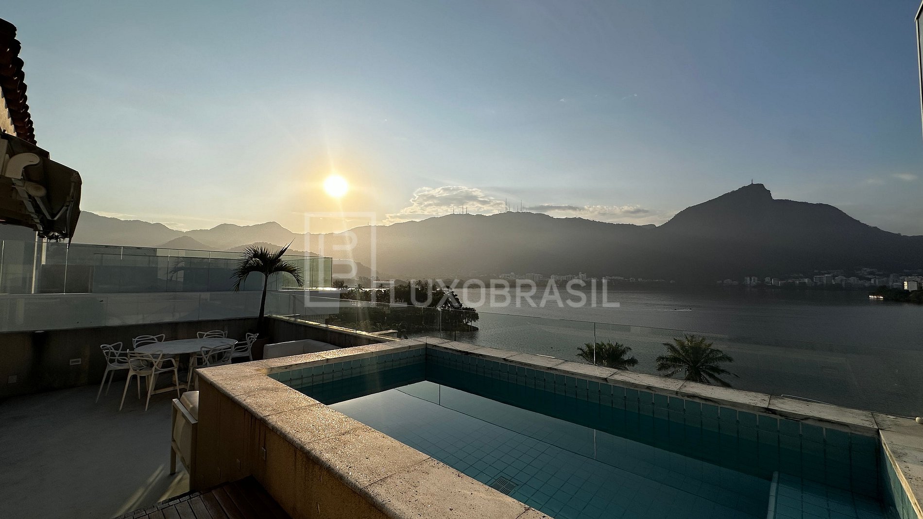 A área da piscina é um destaque à parte, com sofá, mesa e uma vista incrível da Lagoa, perfeita para momentos de relaxamento e lazer.
