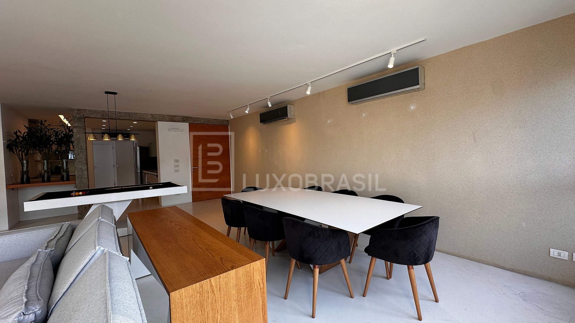 A sala de estar integrada com a sala de jantar, equipada com uma mesa de sinuca e cortina automática, proporcionando um ambiente moderno e funcional.