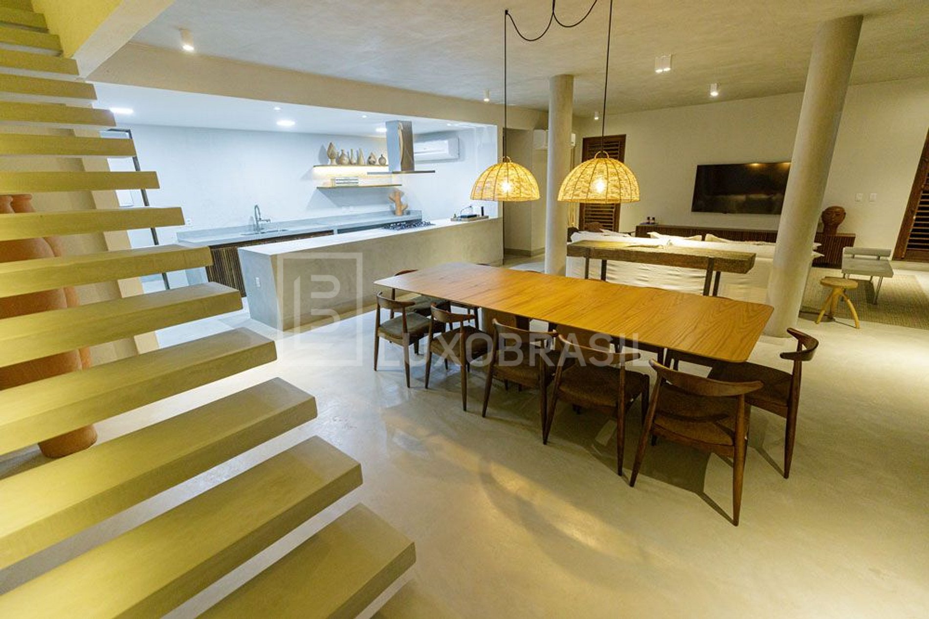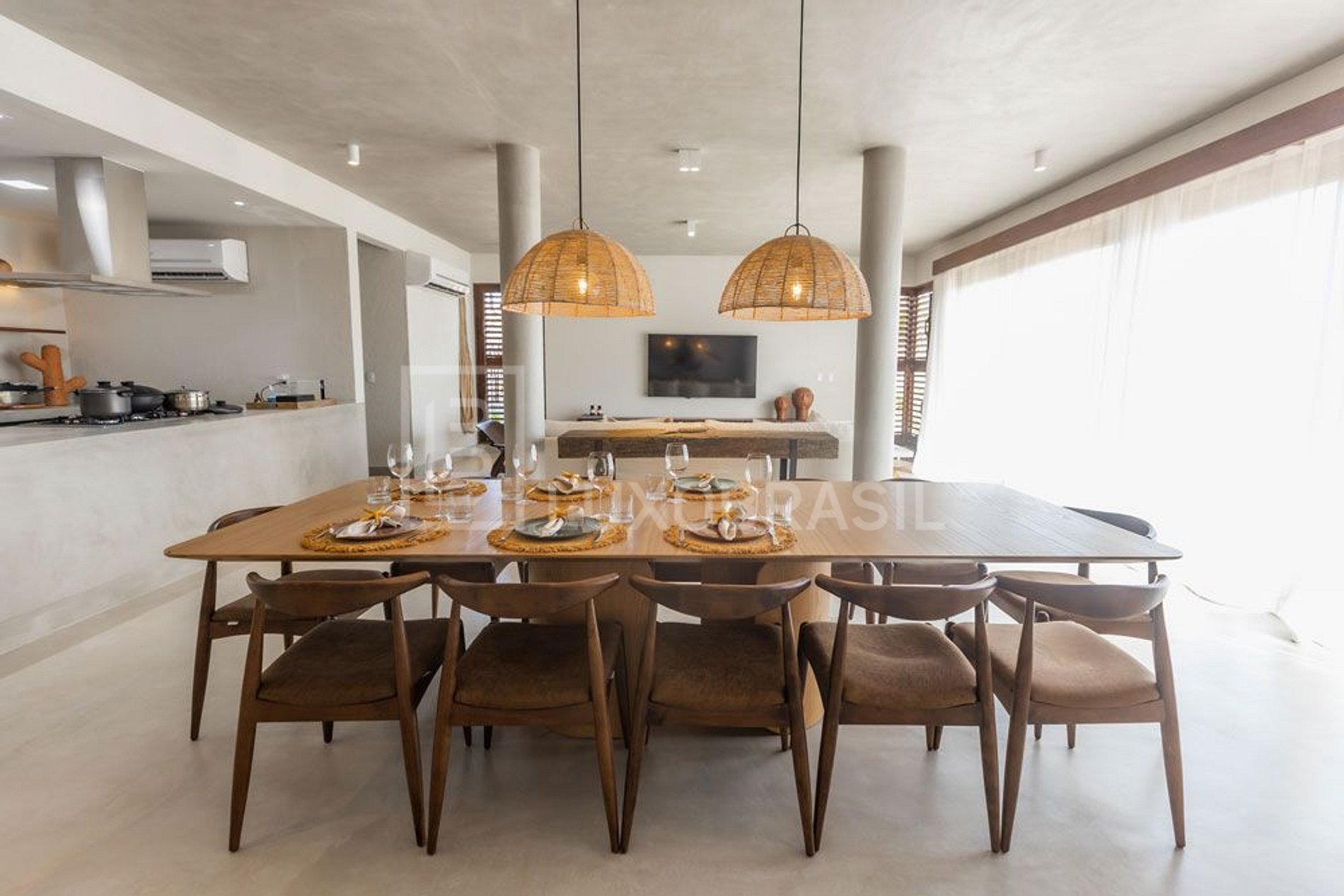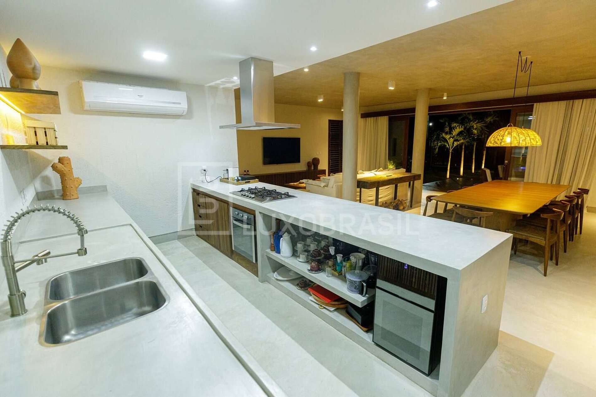 A casa dispõe-se de ampla sala dividida em dois ambientes com sala de estar com TV de 65' e sala de jantar com mesa para 10 pessoas integrada a cozinha americana, toda equipada com cooktop, forno, geladeira duplex, máquina de café Nespresso, adega e utensílios de cozinha, e lavabo.