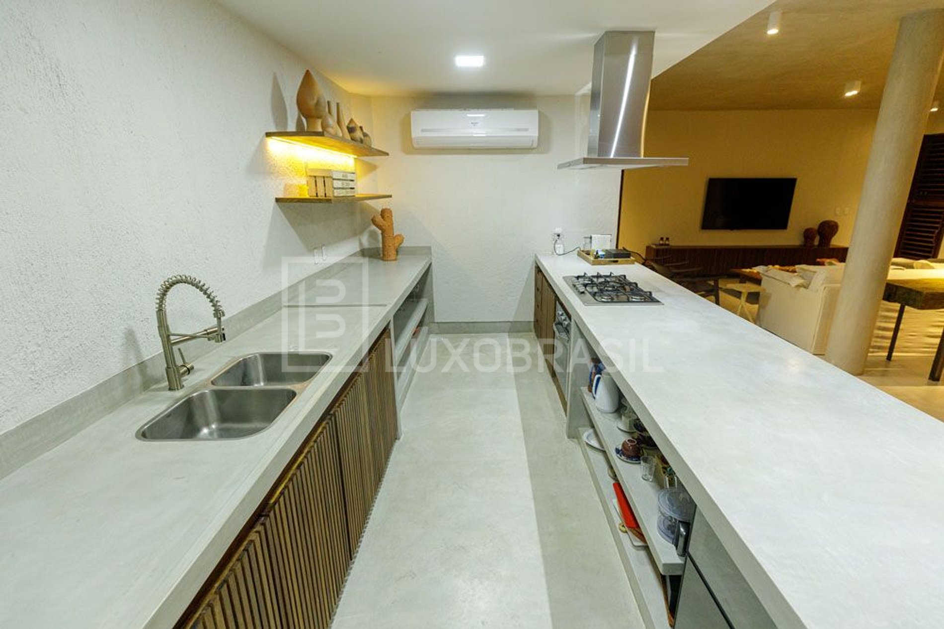 A casa dispõe-se de ampla sala dividida em dois ambientes com sala de estar com TV de 65' e sala de jantar com mesa para 10 pessoas integrada a cozinha americana, toda equipada com cooktop, forno, geladeira duplex, máquina de café Nespresso, adega e utensílios de cozinha, e lavabo.