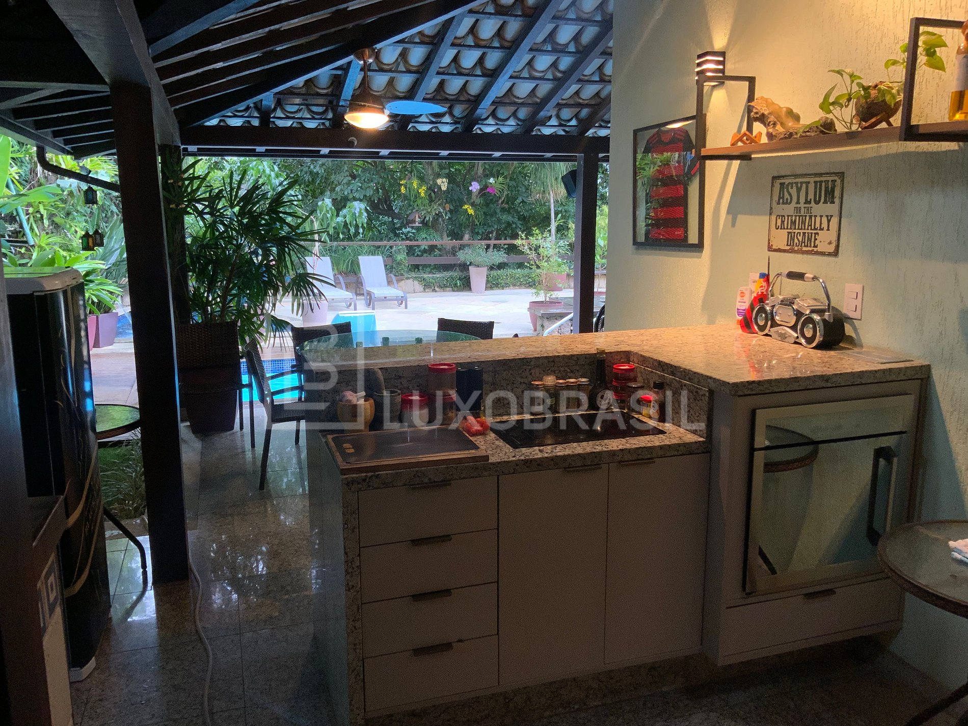 Distribuída em 02 andares, essa charmosa casa conta com 04 suítes, todas localizadas no 2º andar. No seu 1º andar, temos a sala de estar, sala de jantar, home-theater, cozinha bem equipada e a área de serviço. Maravilhosa área externa com deck de madeira com espaço lounge, lindo jardim, 02 piscinas, sendo uma com cascata e iluminação, e uma maravilhosa área gourmet com churrasqueira, freezer, mesas, bar de caipirinha, e banheiros masculino e feminino.