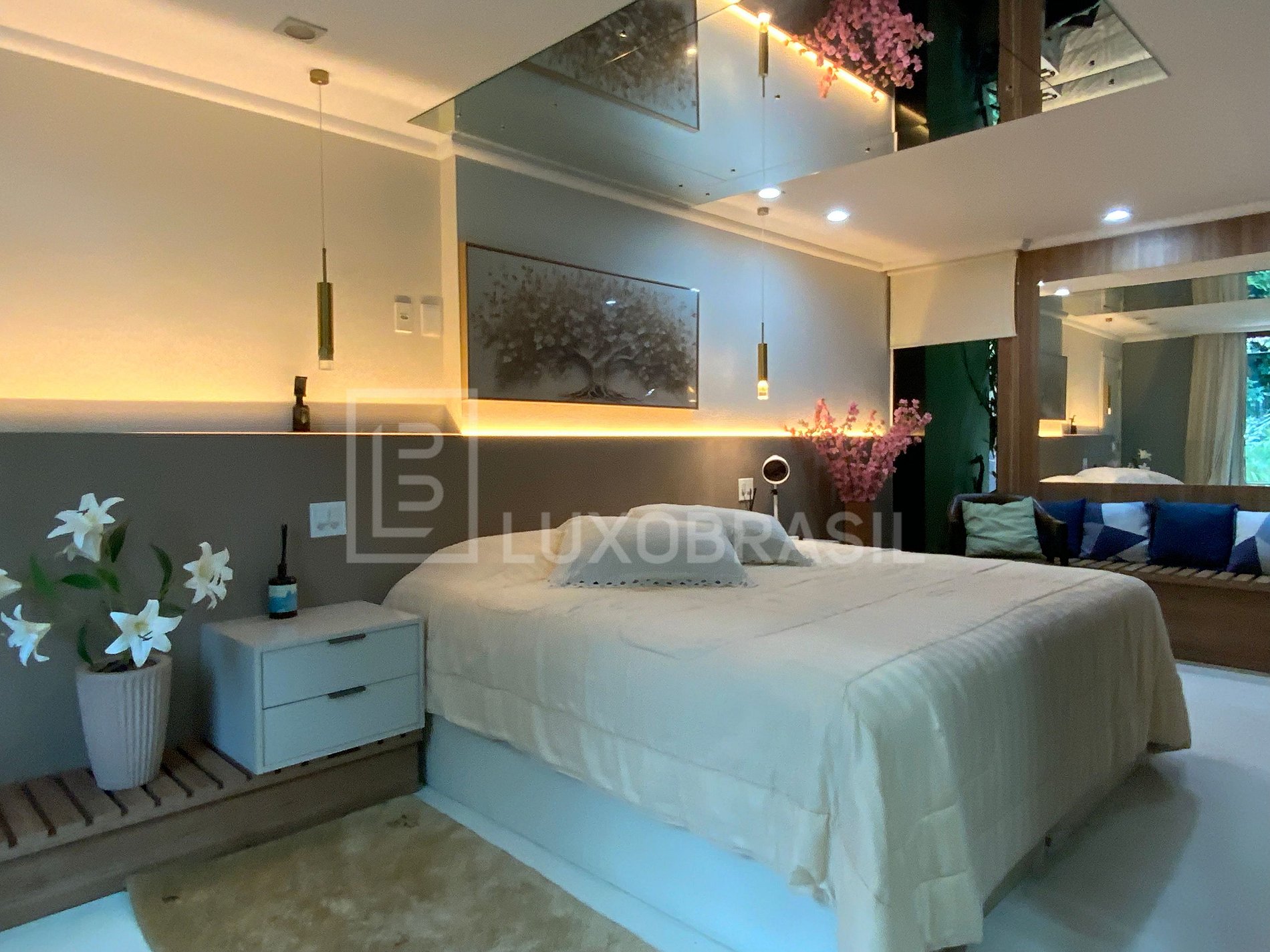 Distribuída em 02 andares, essa charmosa casa conta com 04 suítes, todas localizadas no 2º andar. No seu 1º andar, temos a sala de estar, sala de jantar, home-theater, cozinha bem equipada e a área de serviço. Maravilhosa área externa com deck de madeira com espaço lounge, lindo jardim, 02 piscinas, sendo uma com cascata e iluminação, e uma maravilhosa área gourmet com churrasqueira, freezer, mesas, bar de caipirinha, e banheiros masculino e feminino.