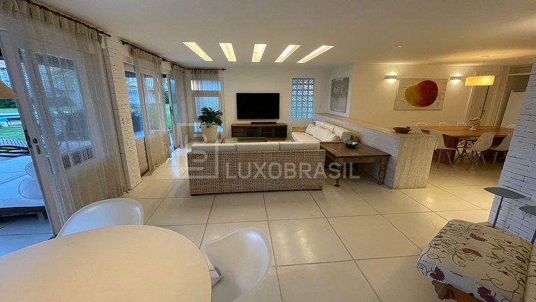 Imóvel com 02 andares, 06 quartos, sendo 05 suítes. Sala de estar e jantar integradas, varanda, cozinha e lavanderia. Condomínio do Sol, com poucas casas, piscina compartilhada, sauna, área comum em frente a praia. É possível contratar os funcionários do imóvel para trabalhar durante a estadia com arrumação, limpeza e alimentação, mediante custo à parte de acordo com horas de trabalho e período contratado.