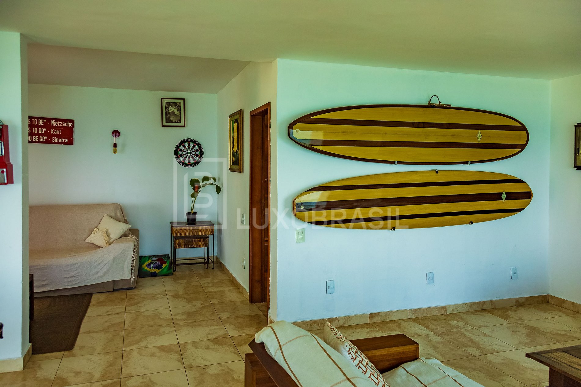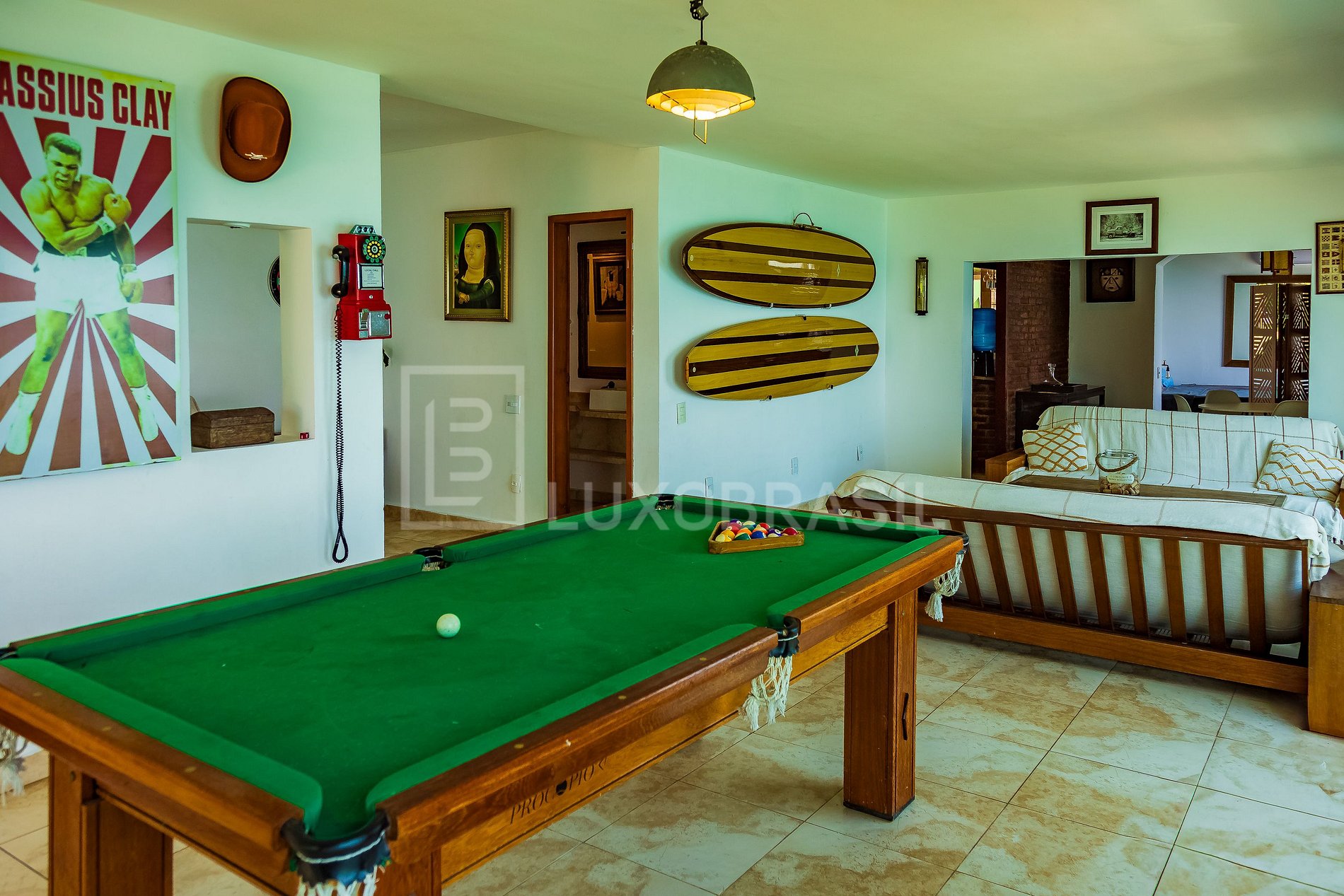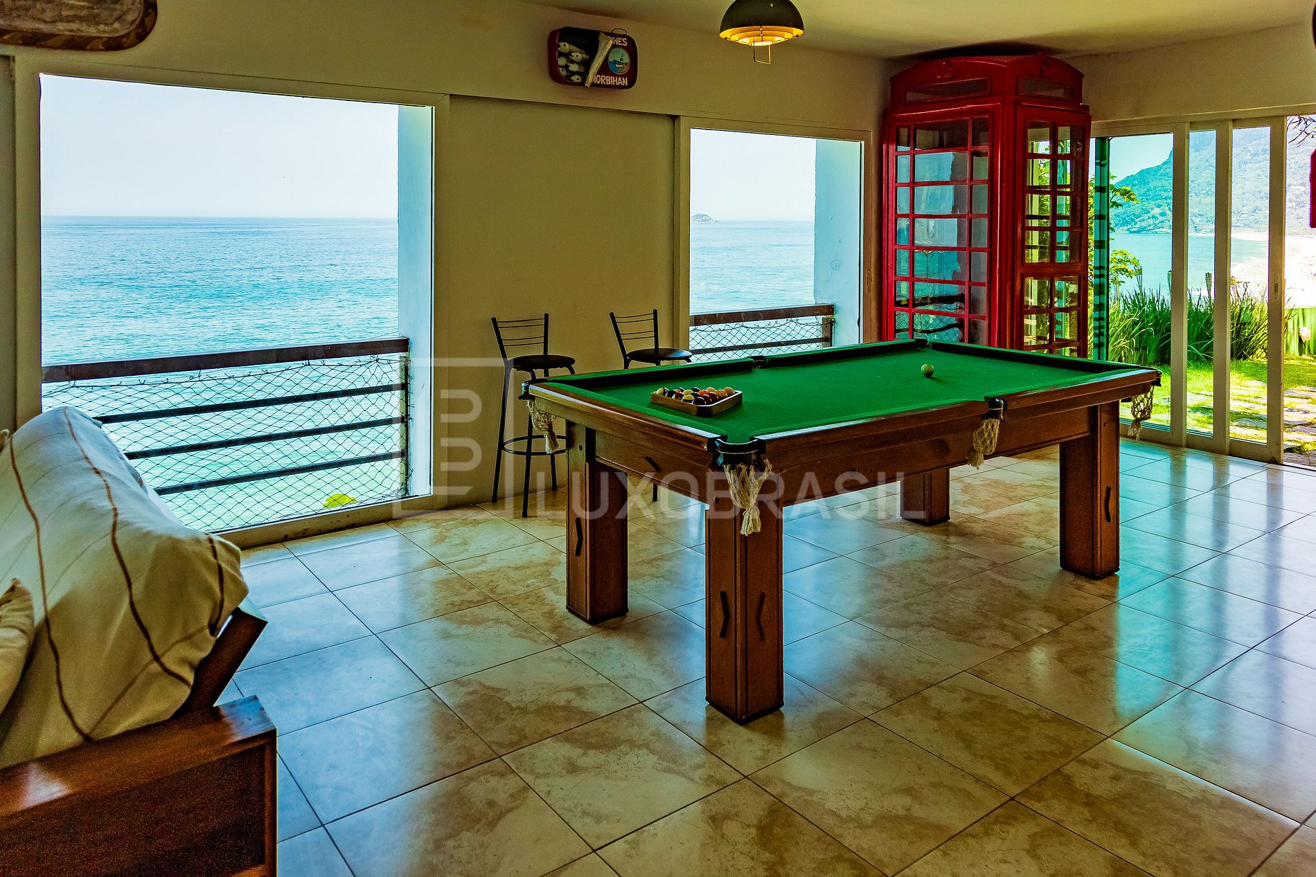 O interior é um verdadeiro convite ao conforto, com sala de estar, sala de jogos com mesa de sinuca, sala de jantar e a cozinha totalmente equipada.