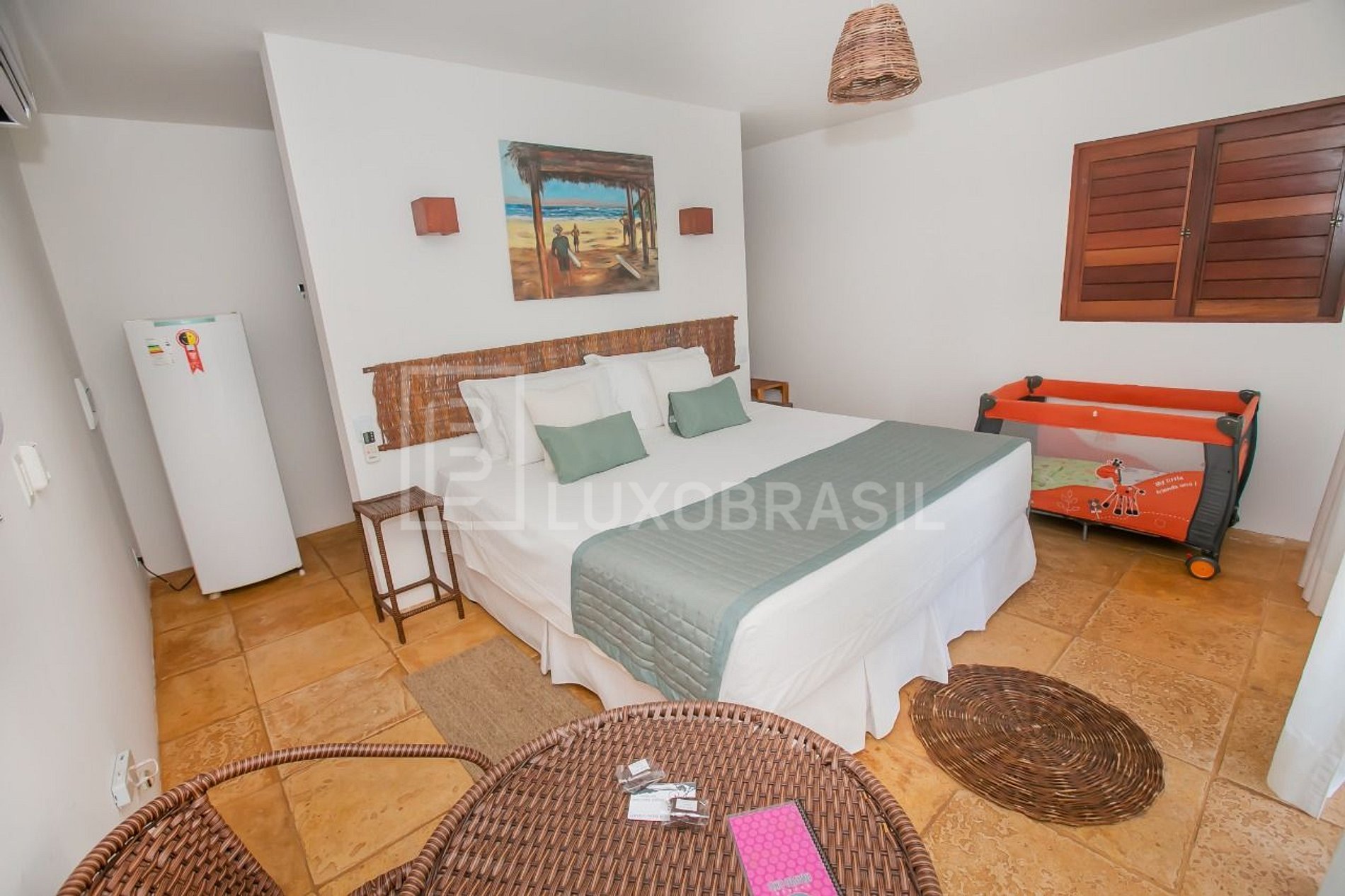 Cama king Size, Excelente café da manhã, Janelas com tela protetora contra insetos, Banheiro privativo com ducha e vaso sanitário em ambientes separados; Closet; Ar-condicionado split; Frigobar; Cofre; Secador de cabelo; Máquina de café expresso; Varanda coberta com estar; Wi-fi gratuito; Interfone; Serviço de quarto;