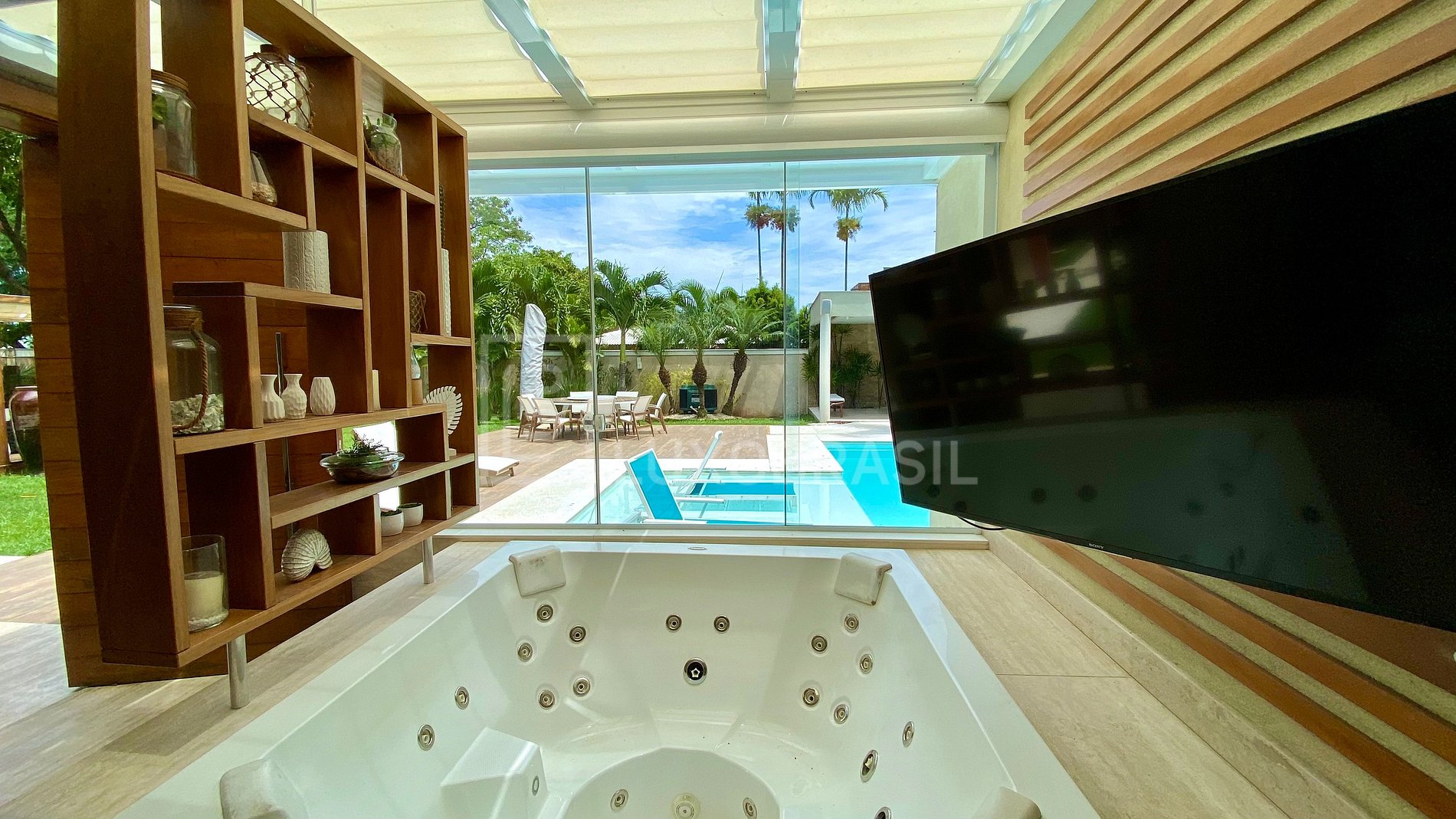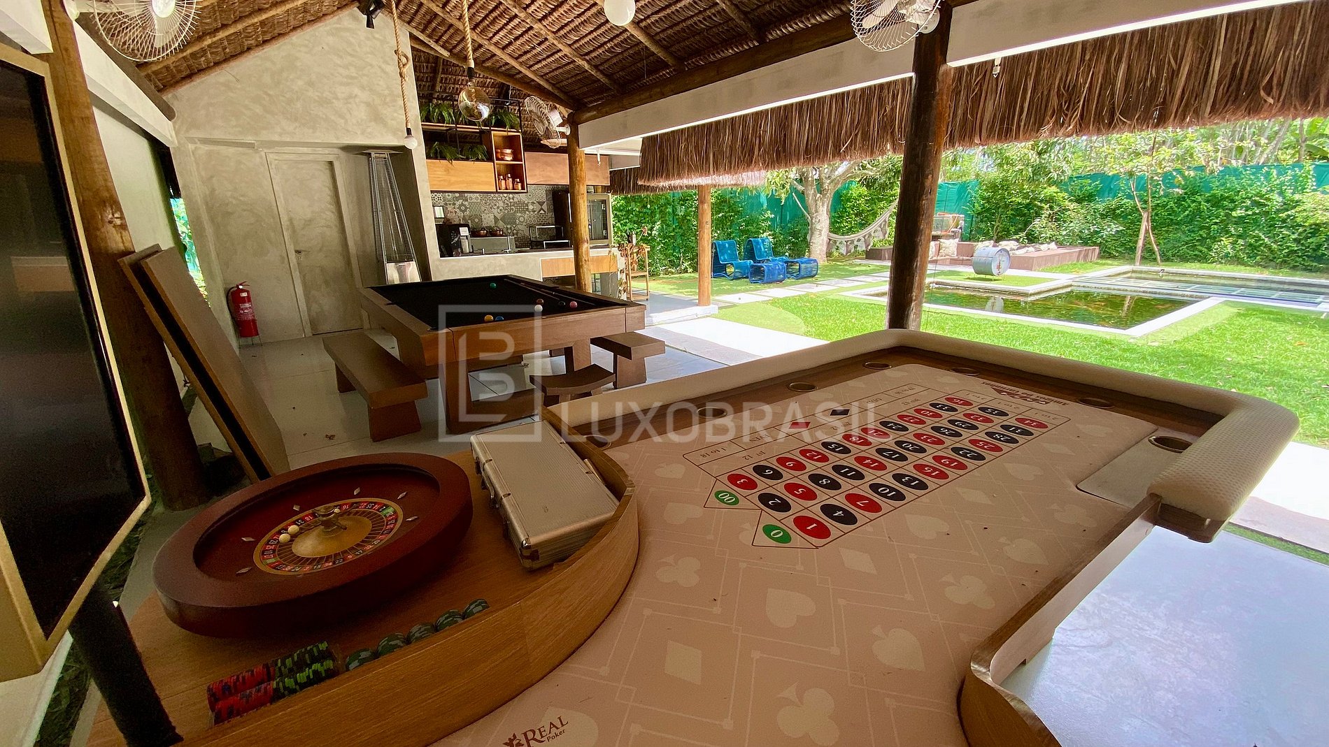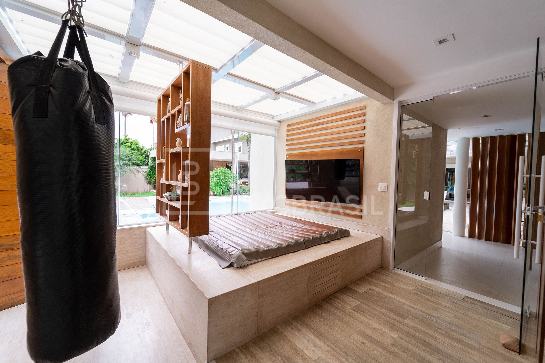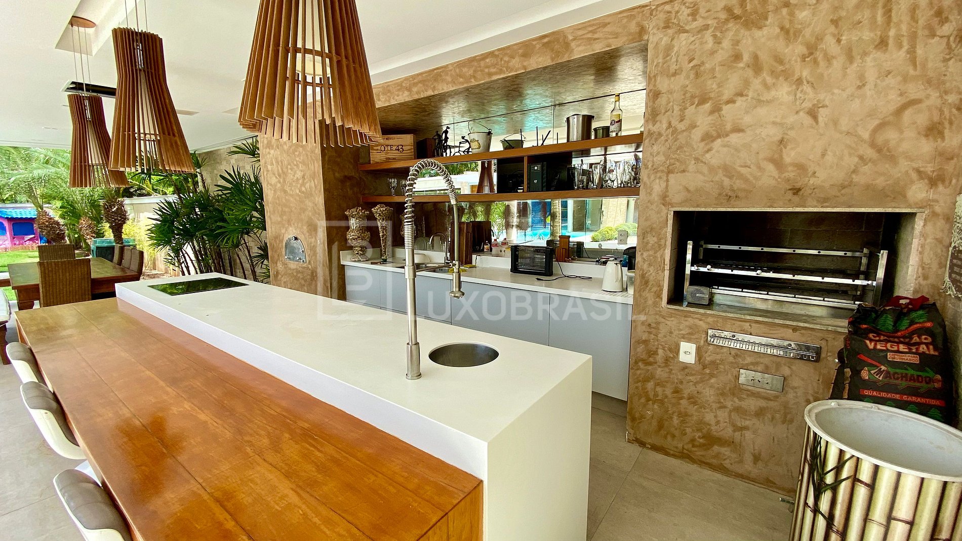 O imóvel possui duas áreas externas, a primeira com piscina, sauna, uma área de churrasqueira, pergolado com pufs, academia com hidromassagem com TV a segunda com um lago, área de jogos com mesa de sinuca, mesa de pôquer, ambiente com lareira externa.