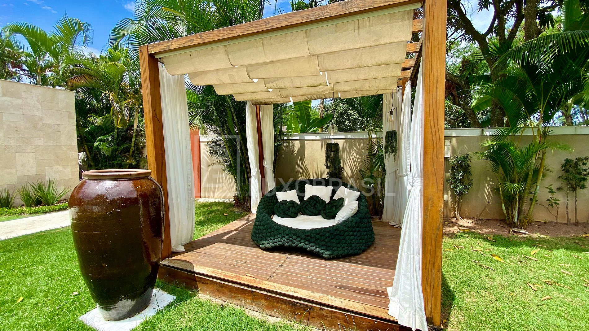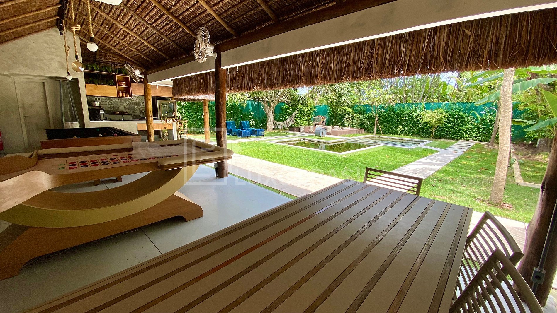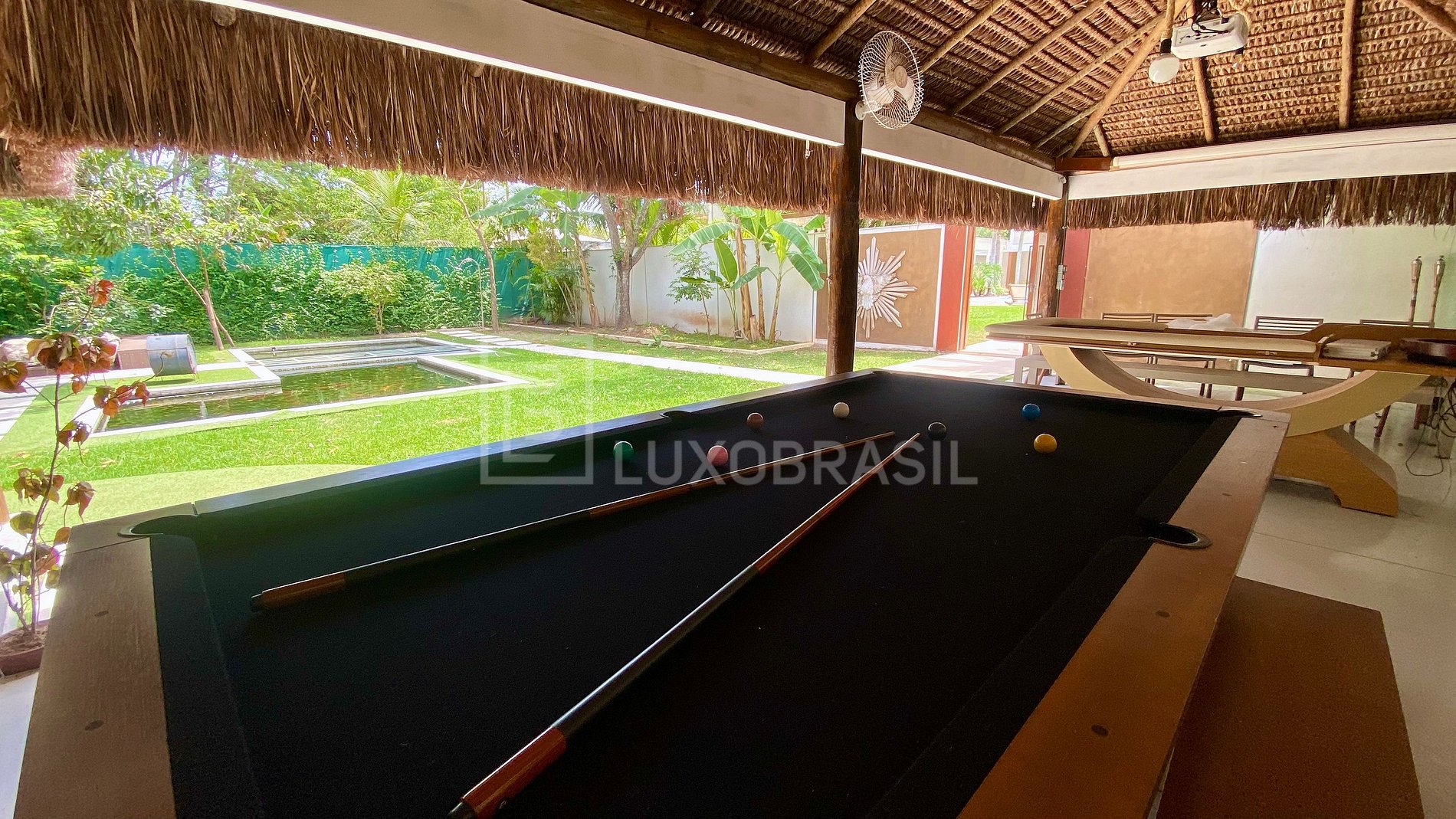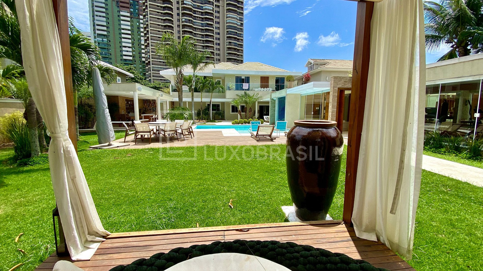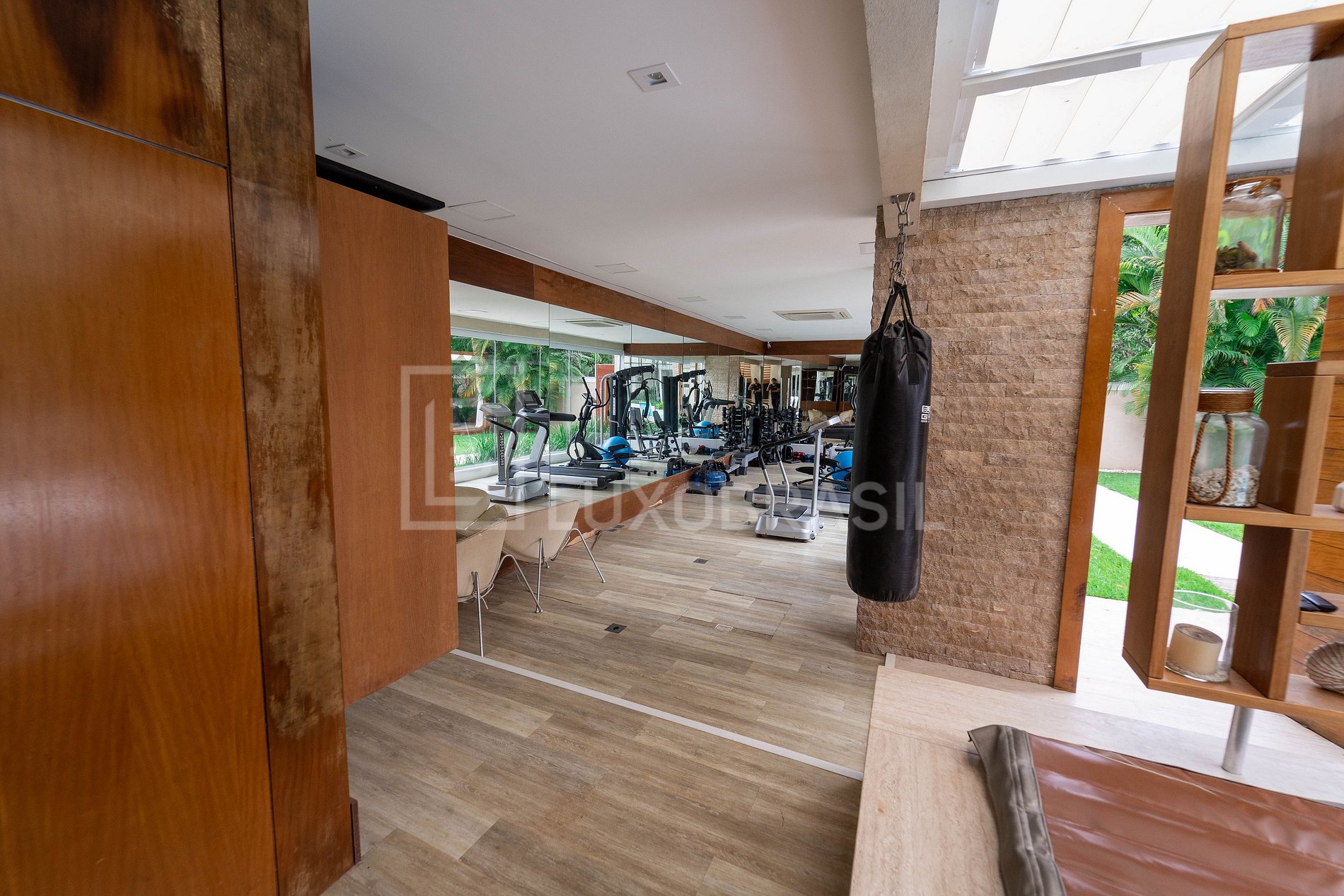 O imóvel possui duas áreas externas, a primeira com piscina, sauna, uma área de churrasqueira, pergolado com pufs, academia com hidromassagem com TV a segunda com um lago, área de jogos com mesa de sinuca, mesa de pôquer, ambiente com lareira externa.