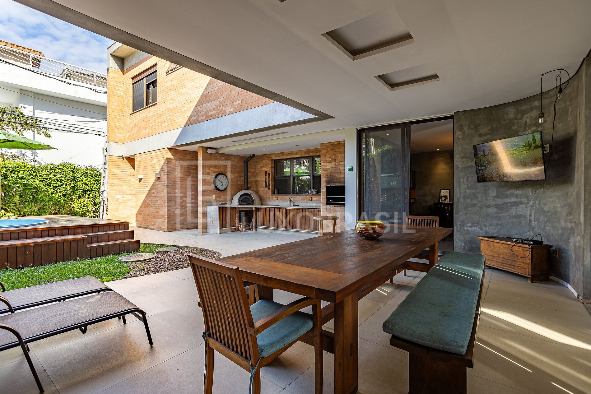 A área externa é composta por área gourmet com churrasqueira e forno de pizza, além de piscina, perfeito para você desfrutar de momentos de lazer.