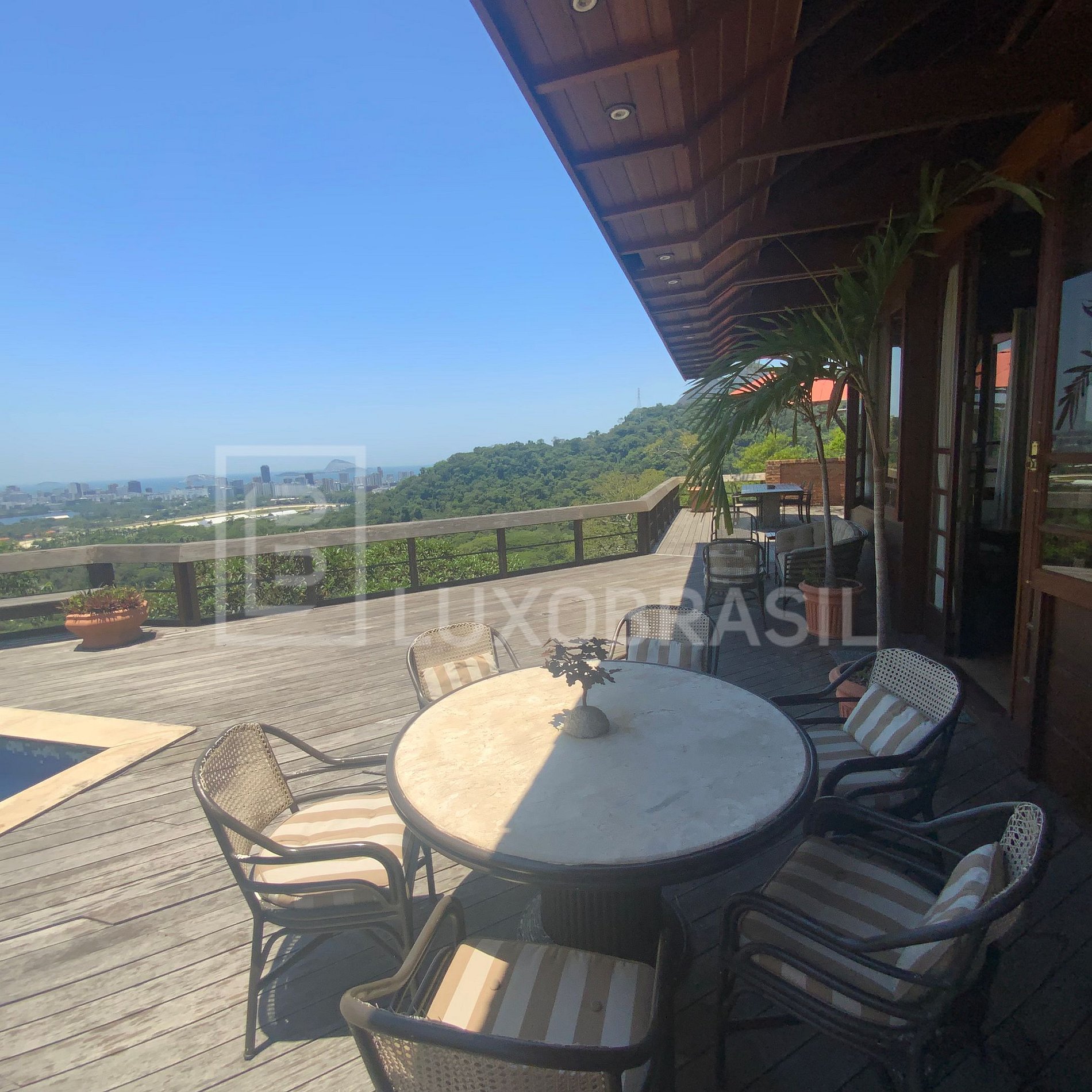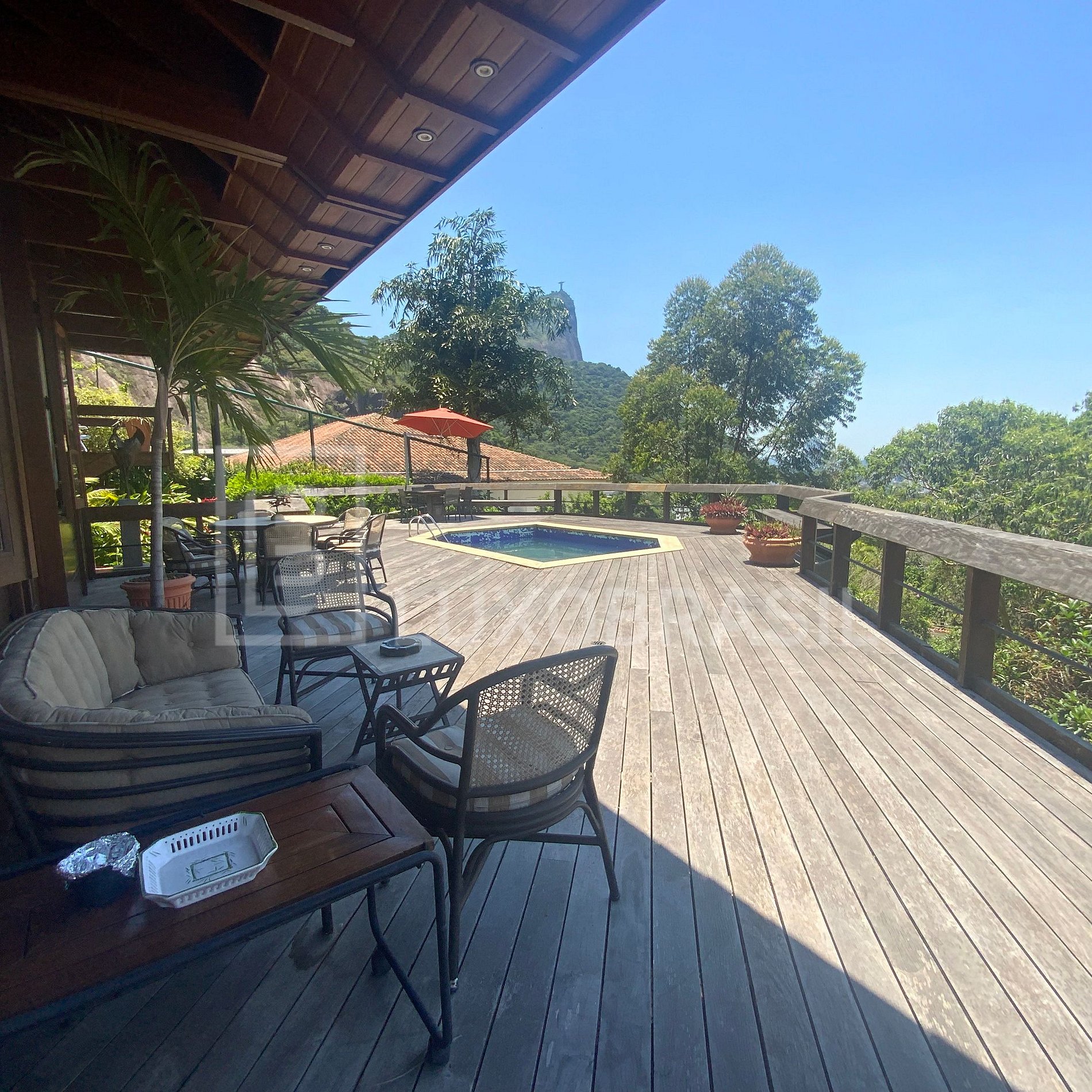 O deck com piscina e churrasqueira oferece uma vista indevassável para o Pão de Açúcar, Cristo Redentor, Lagoa Rodrigo de Freitas, mar do Arpoador, Ipanema e Leblon, as Ilhas Cagarras e o Morro Dois Irmãos — um cenário simplesmente deslumbrante.