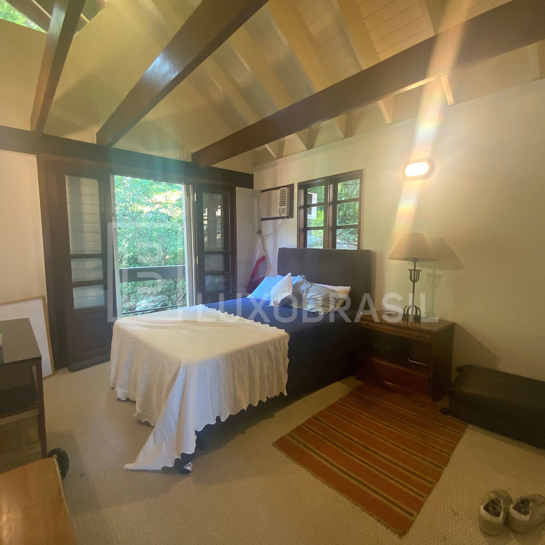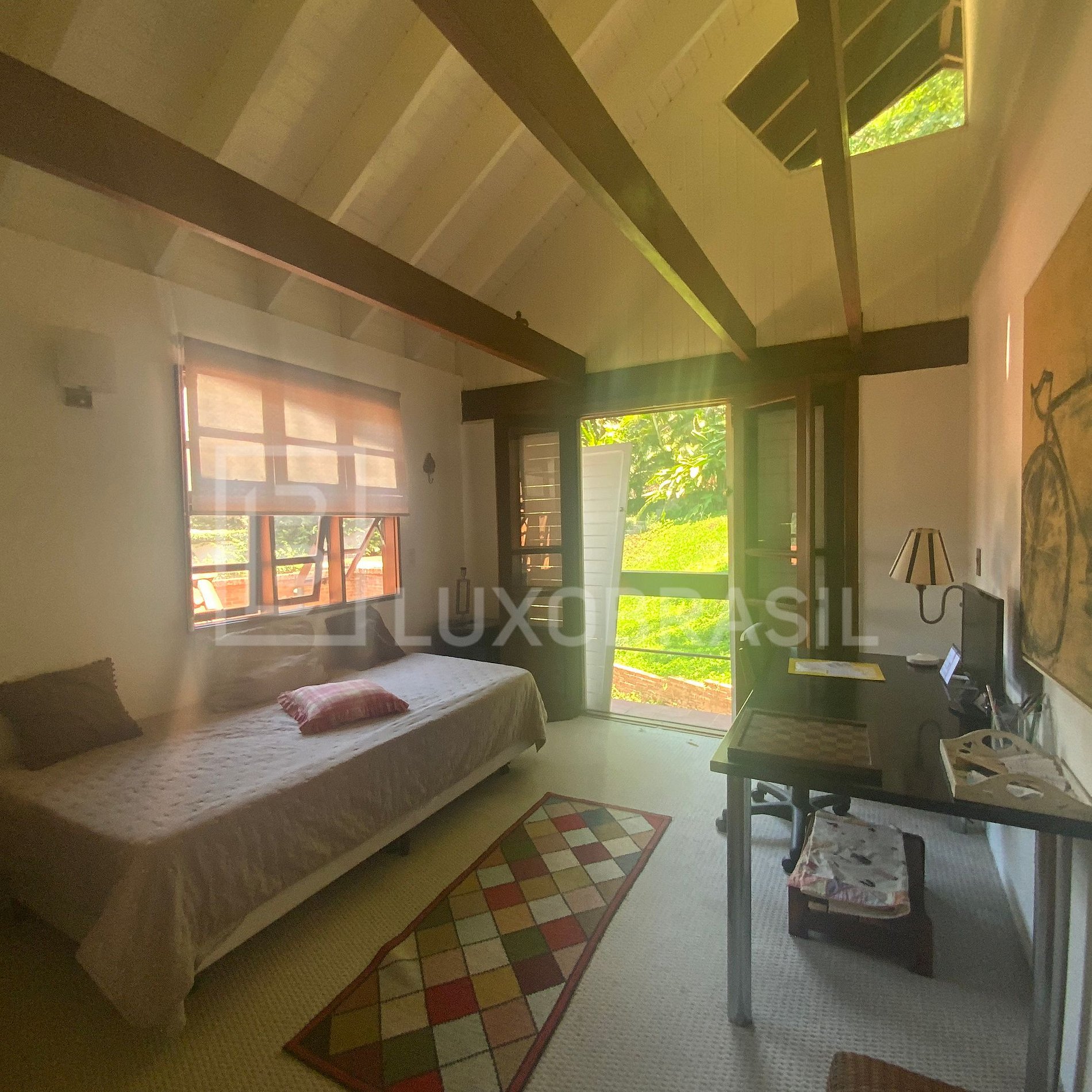 Construída sobre o verde, a casa exibe uma arquitetura única com vigas maciças de Ipê champagne e conhaque, que sustentam os telhados e realçam o aconchego da madeira em cada detalhe.