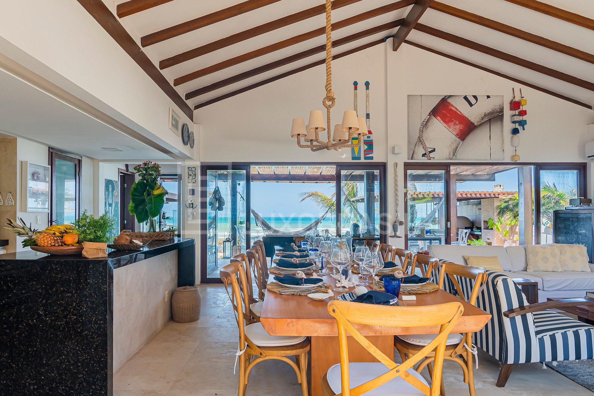 A villa é pé na areia e oferece uma vista espetacular, situada dentro de um condomínio estilo resort. Foi estrategicamente construída sobre um platô de 3m, garantindo total privacidade. Ao leste, estende-se uma faixa de 4 km de praia quase intocada, ideal para caminhadas tranquilas ou corridas revigorantes. Assinada pelo arquiteto norueguês Oivind Lunde, a residência une duas casas através de um amplo deck coberto de 100 m², com projeto de integração desenvolvido pelo arquiteto cearense Luiz Fiuza. Um dos grandes diferenciais é a equipe atenciosa, sempre pronta para proporcionar o melhor da hospitalidade local, incluindo o famoso sushi de tapioca, especialidade da casa.