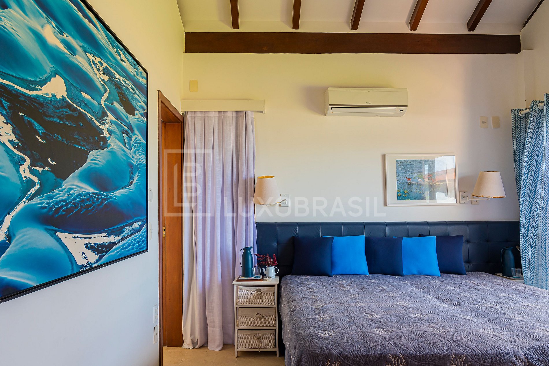 Suíte 1 e 2: Cama king size, closet e vista deslumbrante para o mar.