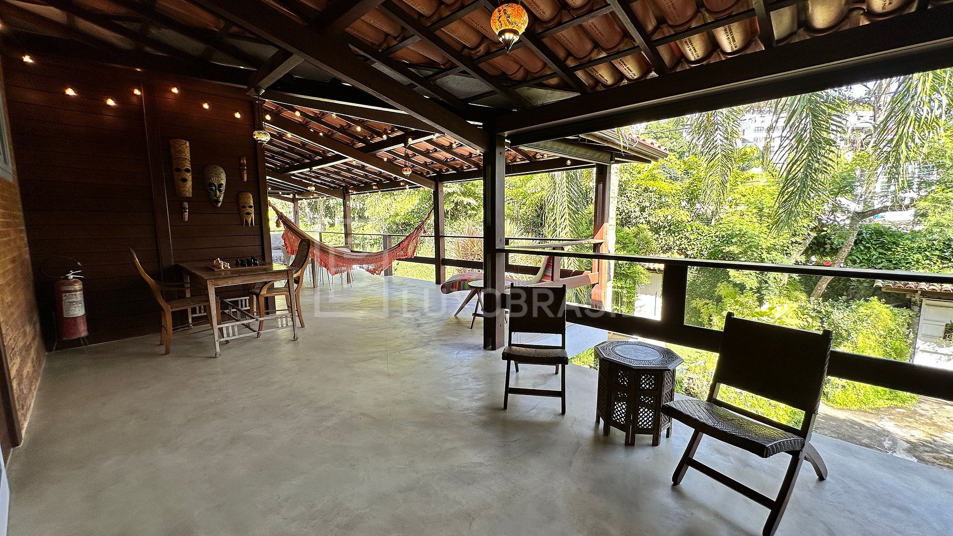1º piso - Jardim com piscina, recentemente reformada, modernizada com luzes noturnas, gramado plano de 400m² com vista para a montanha (Pico dos Quatro), árvores frutíferas, um delicado paisagismo e um charmoso gazebo balinês. A casa é cercada de varandões aconchegantes, possui um amplo lounge coberto com ar-condicionado e portas retráteis que também pode ser usado para home office ou pequenas reuniões. Há uma linda pérgola de bambu e eucalipto nos fundos da casa, decorada com luzes e um lindo painel feito de mosaico. Neste piso há 02 lavabos, máquina de Nespresso, um frigobar, uma cervejeira e um cooler vintage, além dos móveis de estar. A casa fornece cangas, toalhas, chinelos, cadeiras e barracas para a praia e piscina sem custos adicionais.