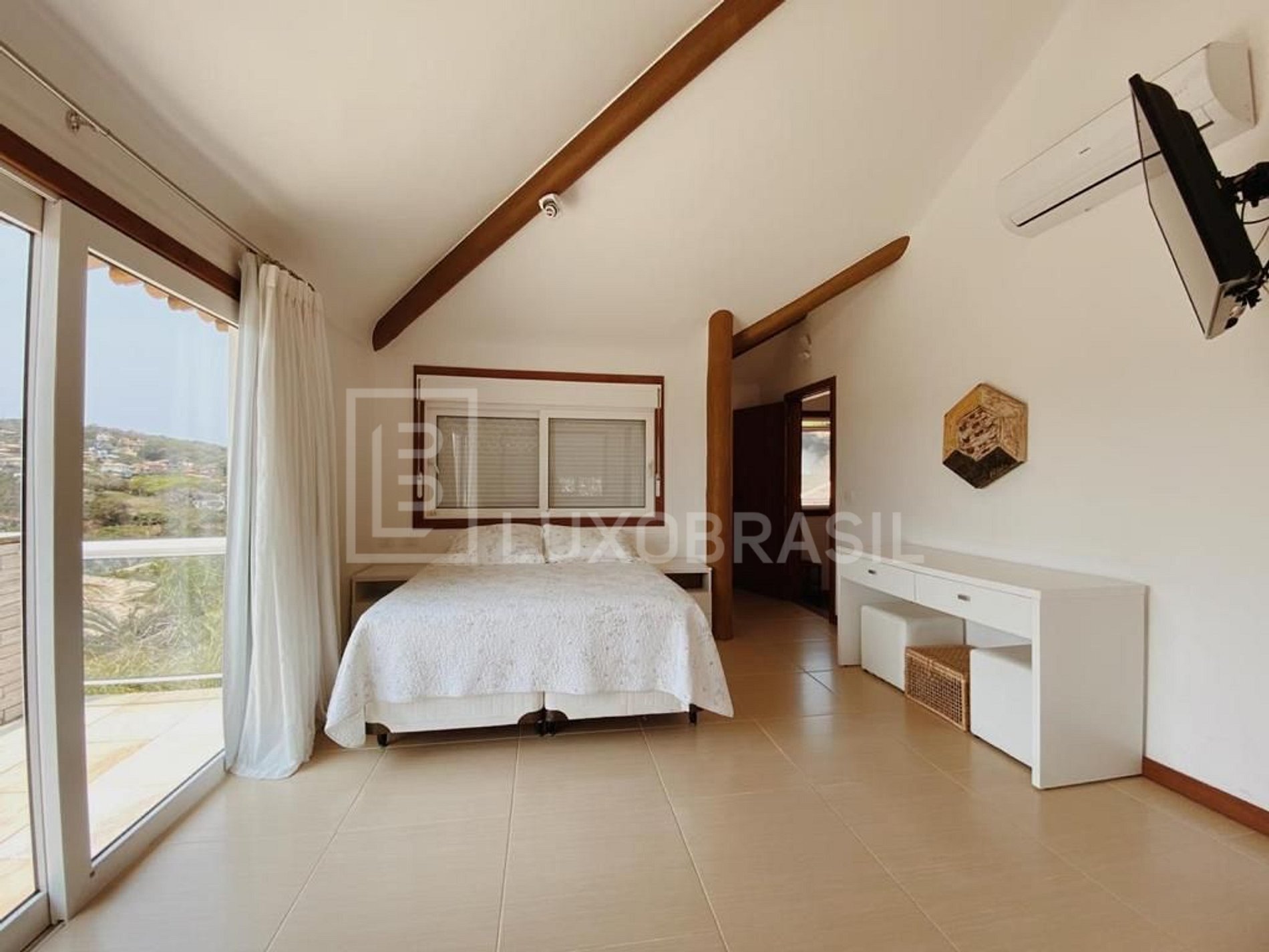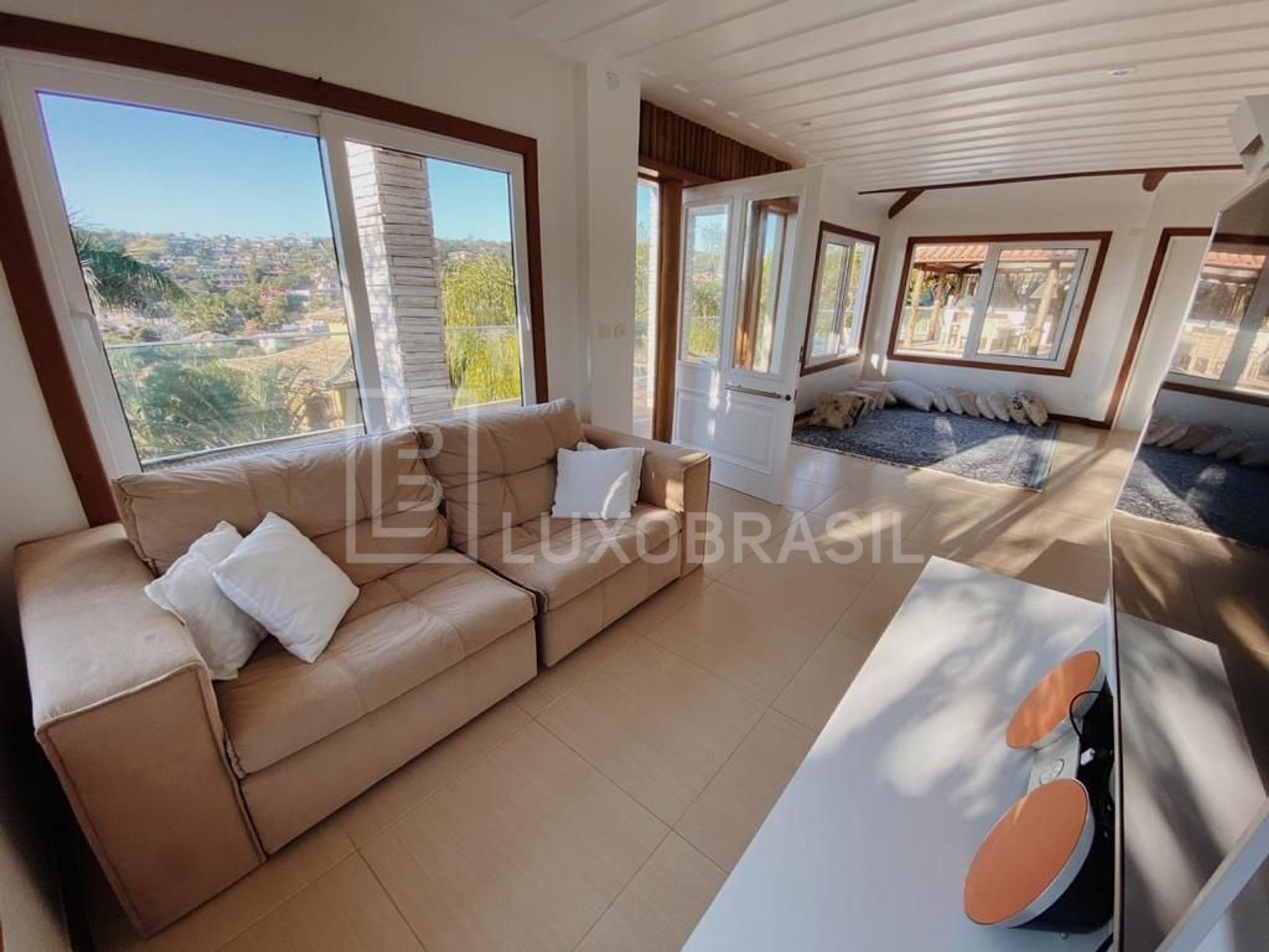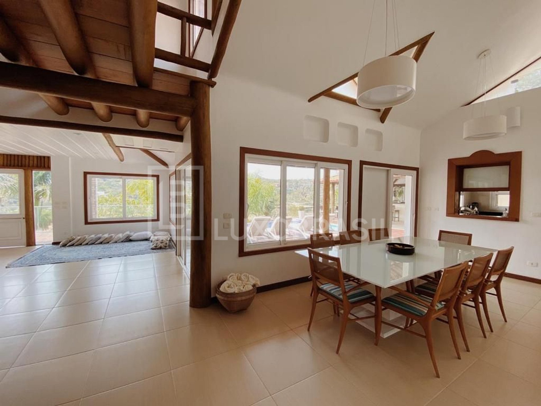 A casa possui 06 suítes, todas com ar-condicionado e TV, sala de estar com sofá e Smart TV 55", ampla sala de jantar, espaçosa e iluminada cozinha equipadas com todos os utensílios necessários e um espaço com adega de vinhos com mesa de 04 lugares para apreciar um bom vinho, seguido de uma boa conversa.