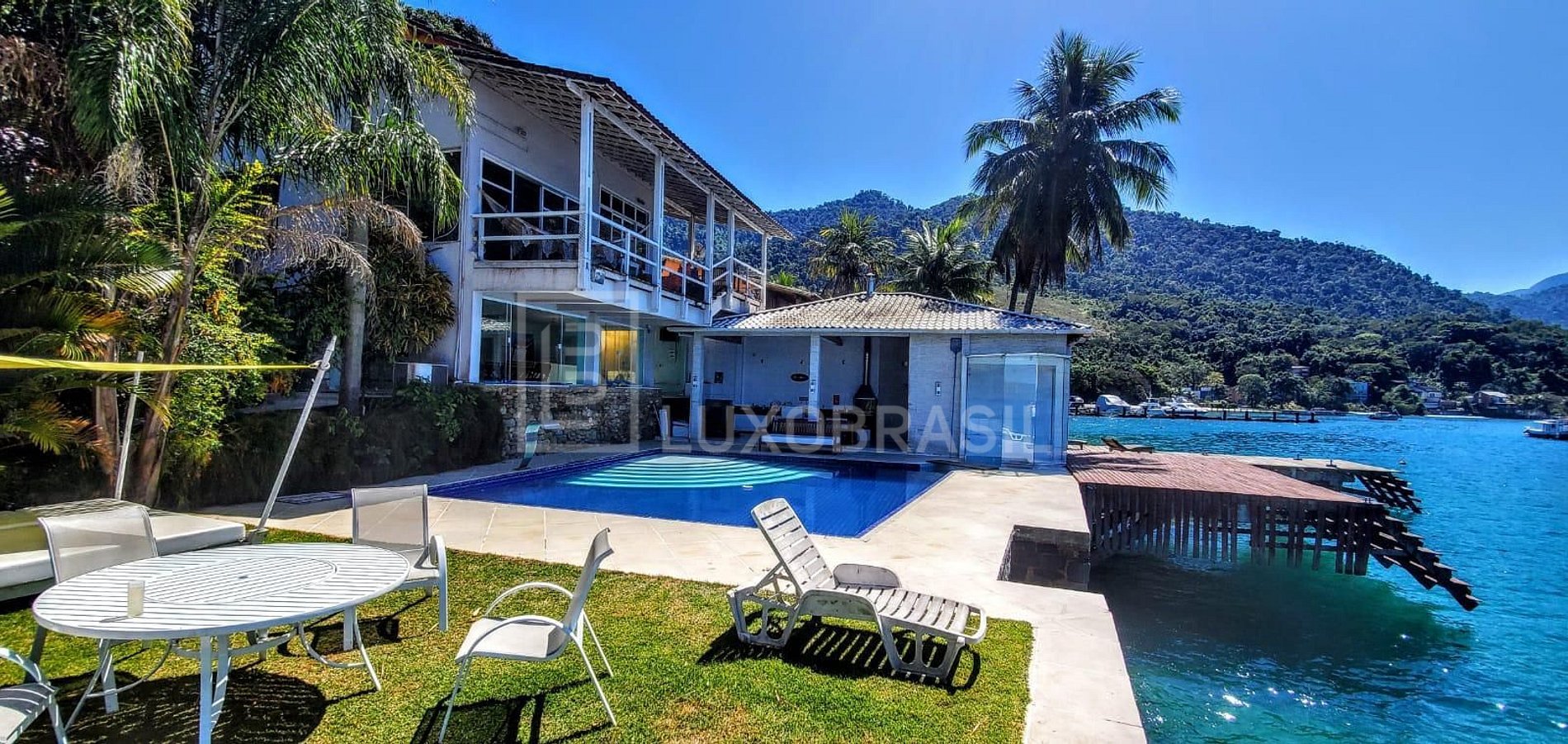 A mansão possui 05 quartos, ampla sala de estar, sala de TV, sala de jantar, cozinha completa e 07 banheiros. A área externa possui área gourmet com churrasqueira, sauna, piscina com uma vista incrível, varanda com rede, heliponto, garagem coberta com 03 vagas e cais para embarcação até 80 pés.
