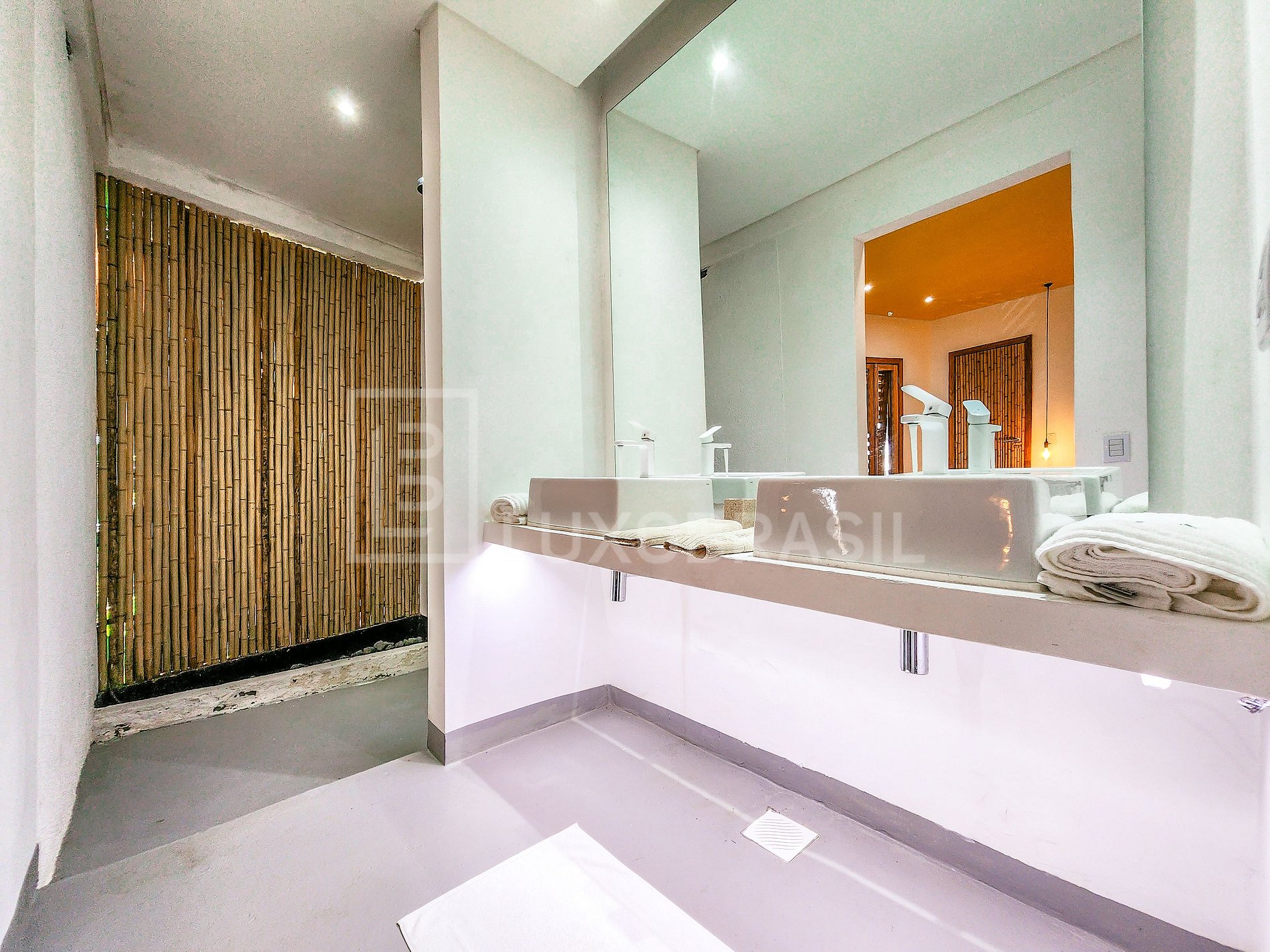 A mansão possui 05 suítes na casa principal e 02 novas suítes no anexo da casa. A suíte master desfruta de ofurô e sala de massagem. Dispõe também de uma ampla sala de estar, sala de TV com mesa de sinuca, sala de jantar, cozinha completa, lareira externa, piscina cinematográfica aquecida, sauna seca, sauna a vapor, academia completa, piscina aquecida com raia de 25 metros para natação, área gourmet com churrasqueira e forno de pizza. Além de um exclusivo heliponto, lavanderia aberta, equipamentos náuticos como Stand up, bóia, e caiaque disponíveis. Área comum do condomínio com quadra de tênis, campo de futebol e playground.