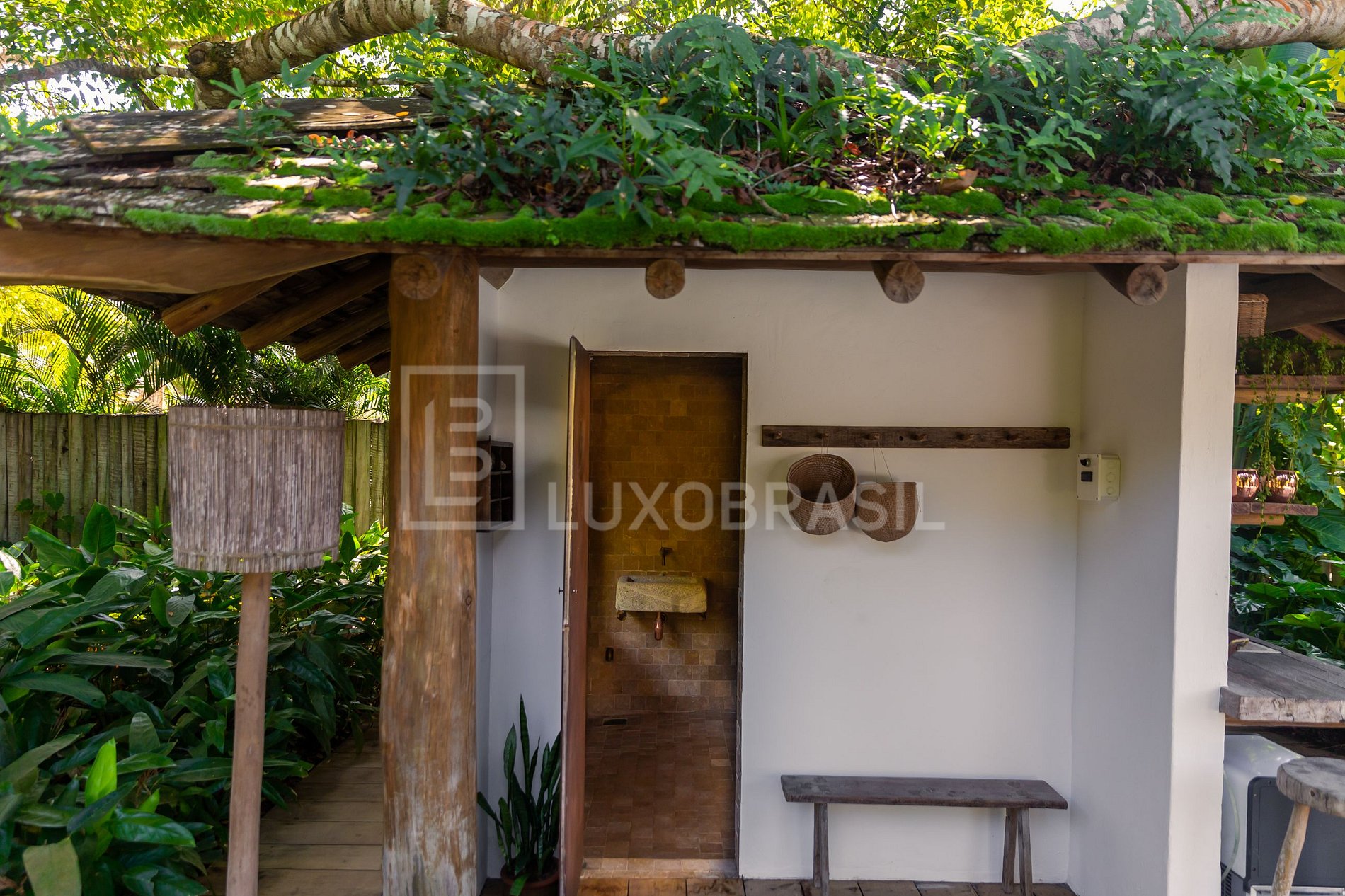 Localizada no Condomínio Altos de Trancoso, a propriedade ocupa um terreno de 5 mil metros quadrados, cercada por um exuberante jardim tropical.