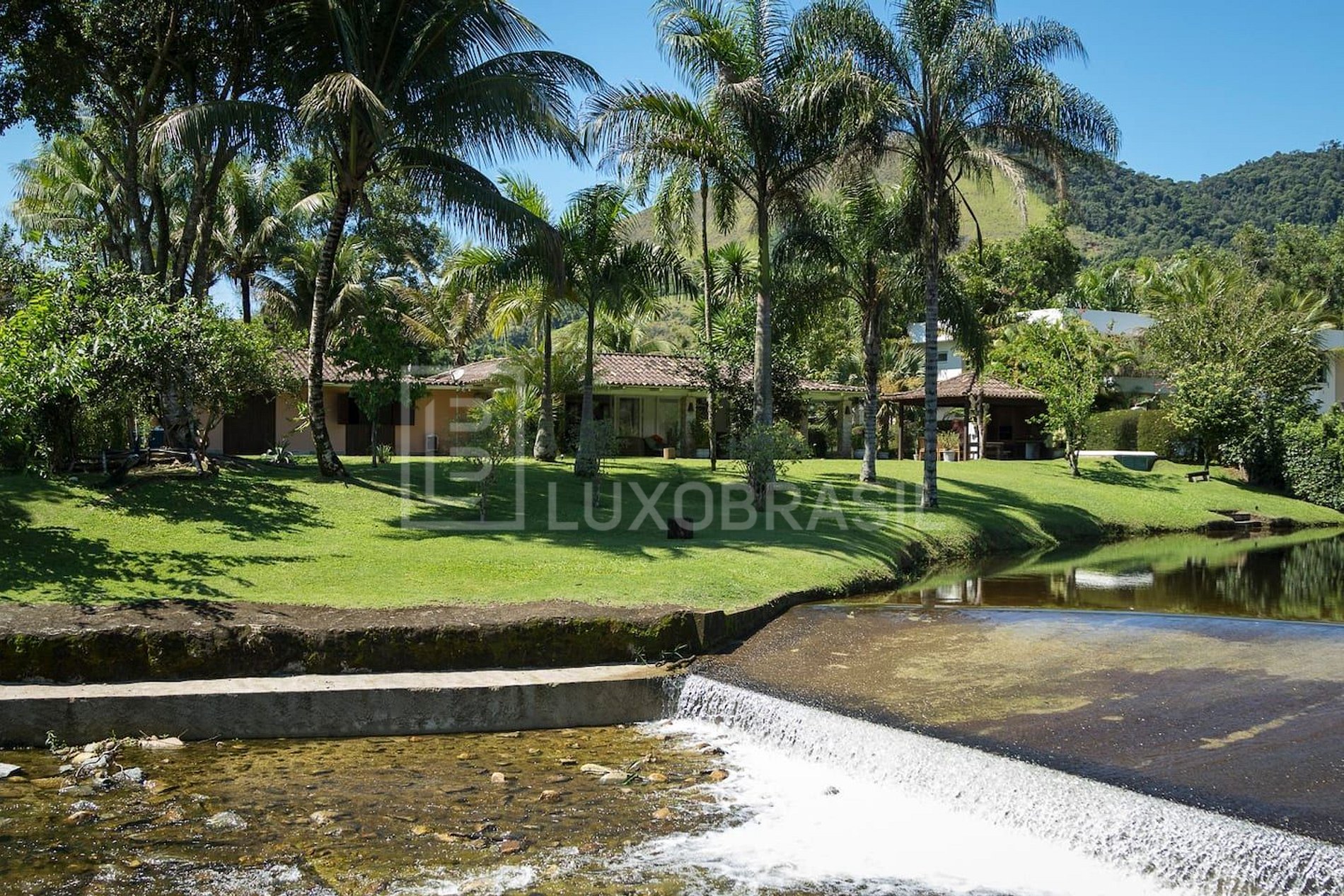 A área externa é um verdadeiro refúgio particular, onde um jardim se integra à paisagem natural, criando um ambiente de tranquilidade e beleza.
