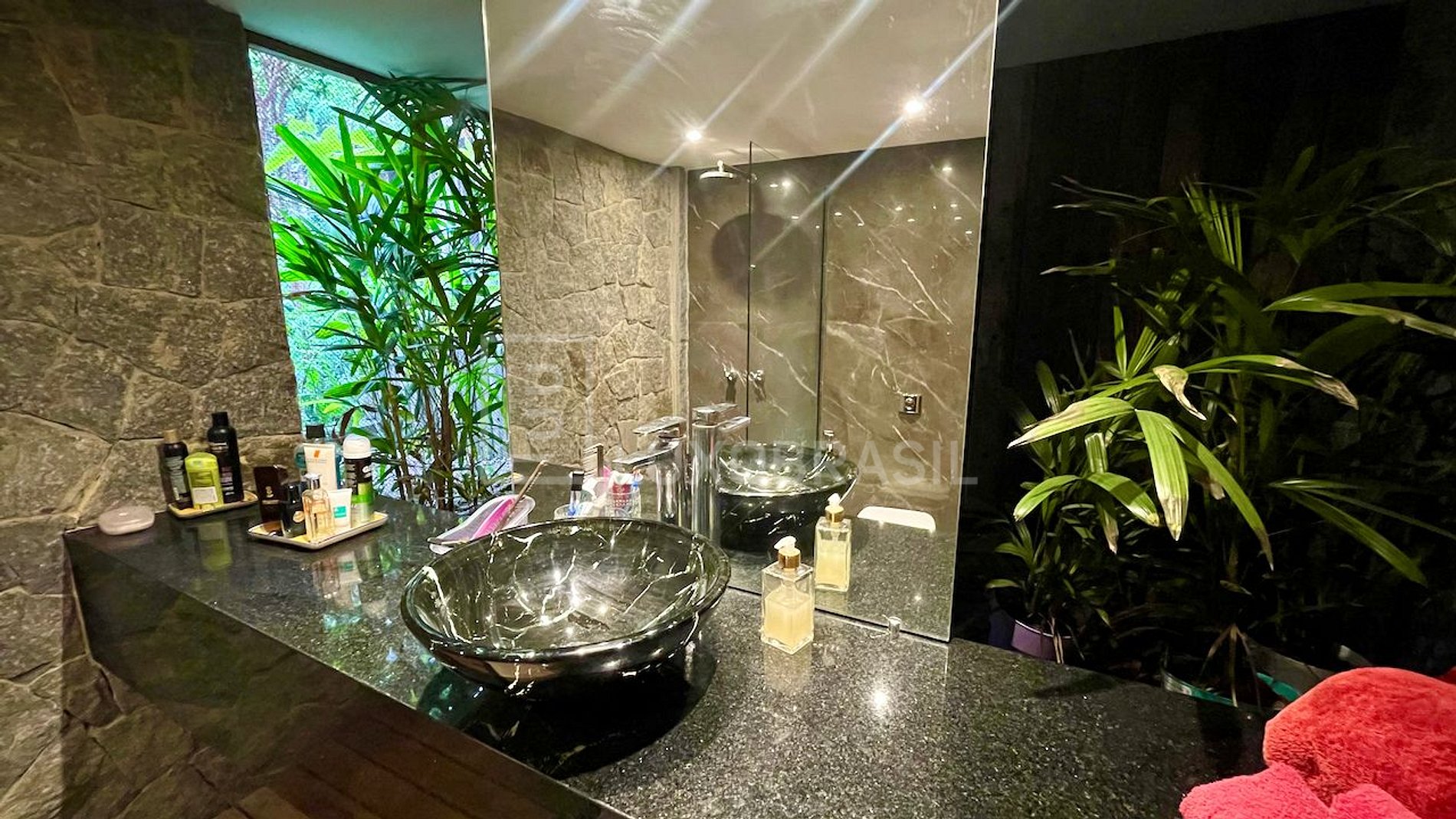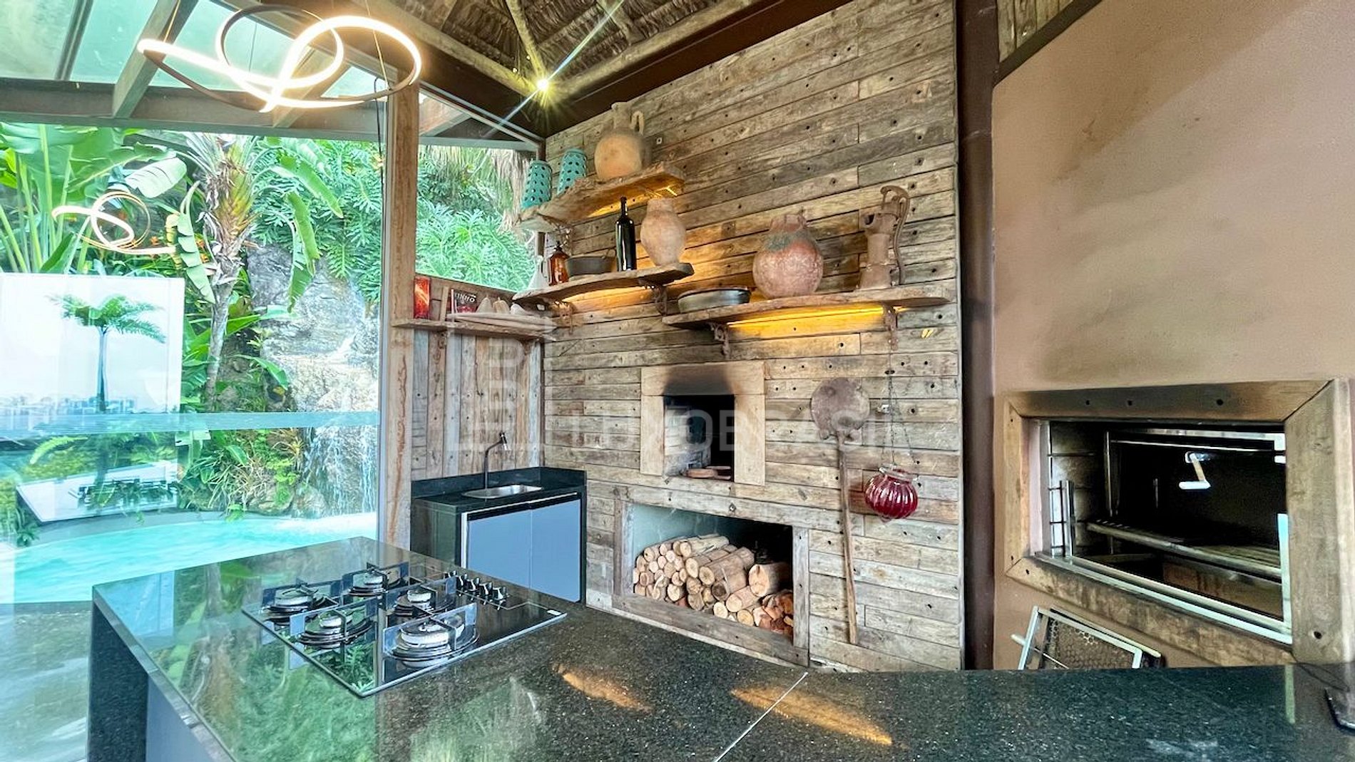 Casa exclusiva para realização de eventos diurnos. Com um projeto no estilo rústico de alto padrão, com pedras nativas, madeira vidro e uma linda vista panorâmica para as ilhas e mar da Barra da Tijuca. O pavimento para a realização do evento possui uma linda piscina com cascata, sauna, espaço gourmet com churrasqueira e forno à lenha, vasta área verde, sala de vídeo, sala de estar, ampla área com mesas e cadeiras, banheiro social, terraço com vista panorâmica e um elevador. O Espaço é 100% equipado, confortável e amplo, apropriado para pequenos eventos, além de ensaios fotográficos e filmagens. Ideal para um almoço ou jantar: cozinha totalmente equipada, com churrasqueira e forno a lenha, adega e cervejeira. Perfeito para um dia de fotos e gravação, com diferentes vistas e luz, ideal também para dia de noiva. O espaço tem elevador e conta com duas suítes e sauna seca.