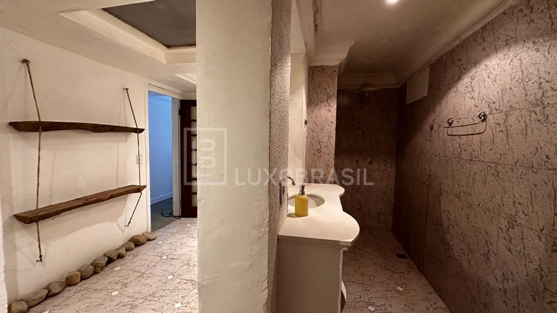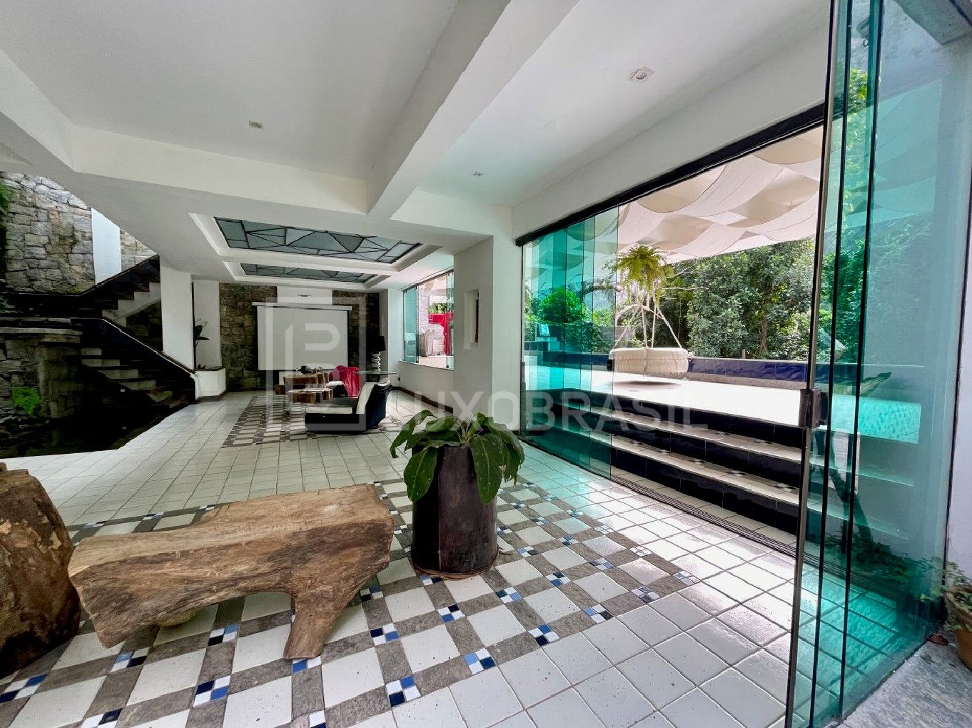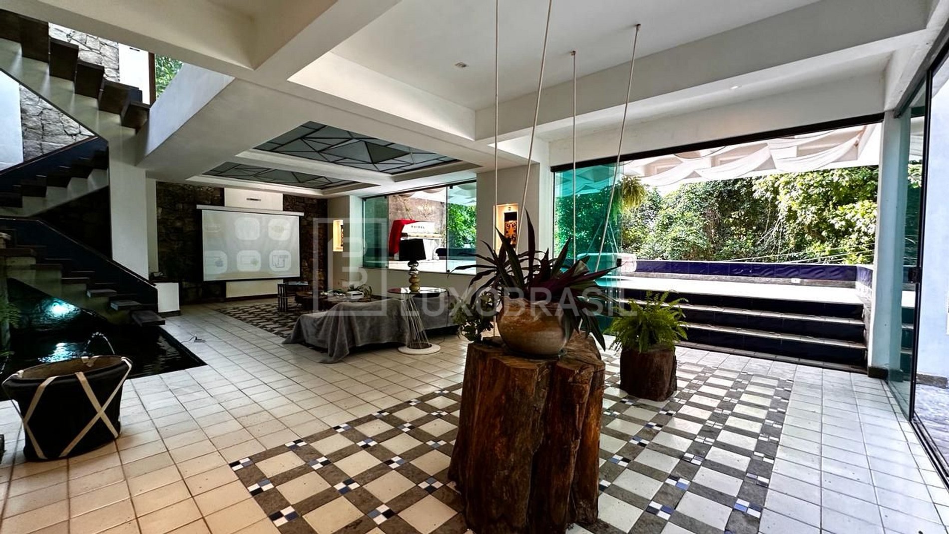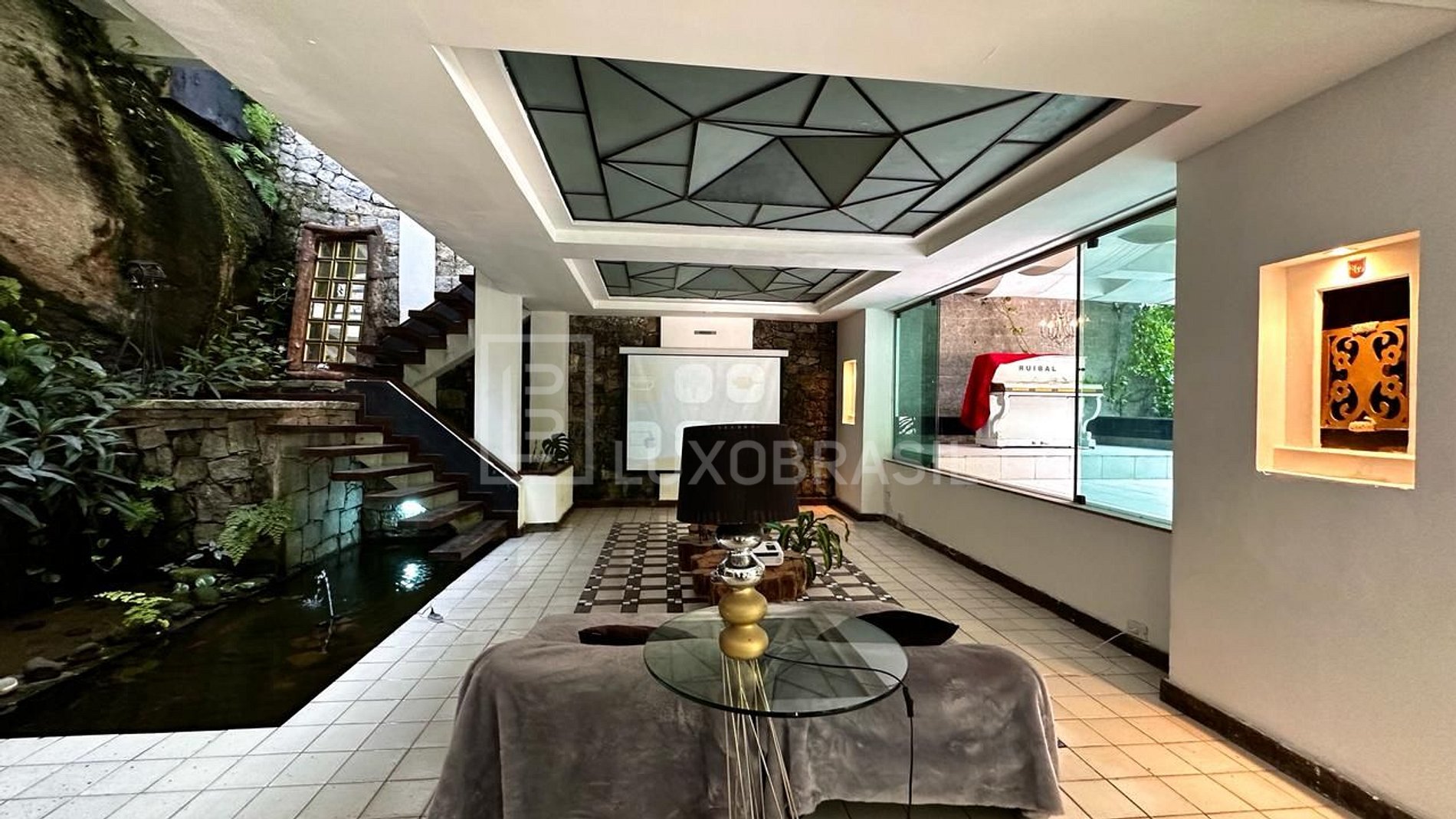 Essa mansão de tirar o fôlego possui três andares mais o térreo, oferecendo espaço e conforto incomparáveis. Ao entrar, você será recebido por uma cachoeira interna natural que cria uma atmosfera única de serenidade e frescor, proporcionando um ambiente relaxante e revigorante.