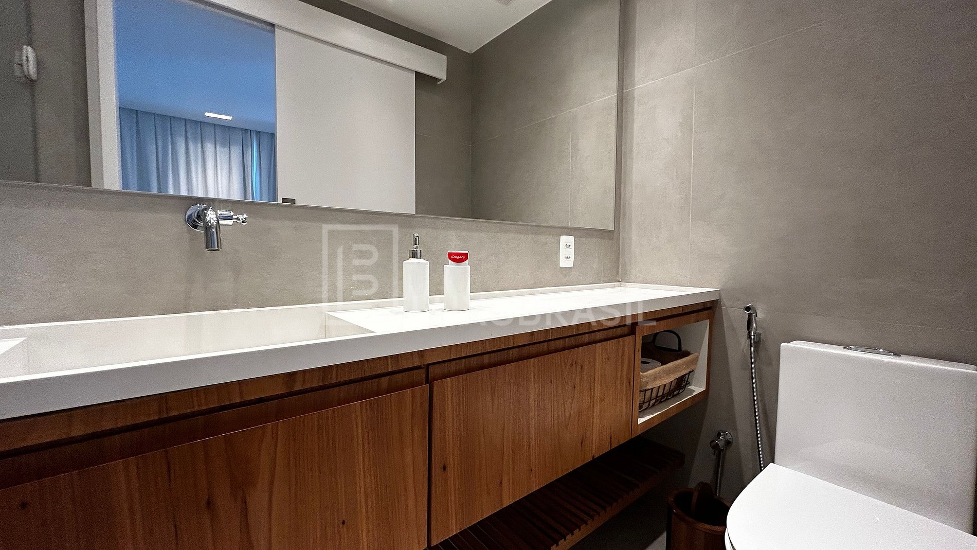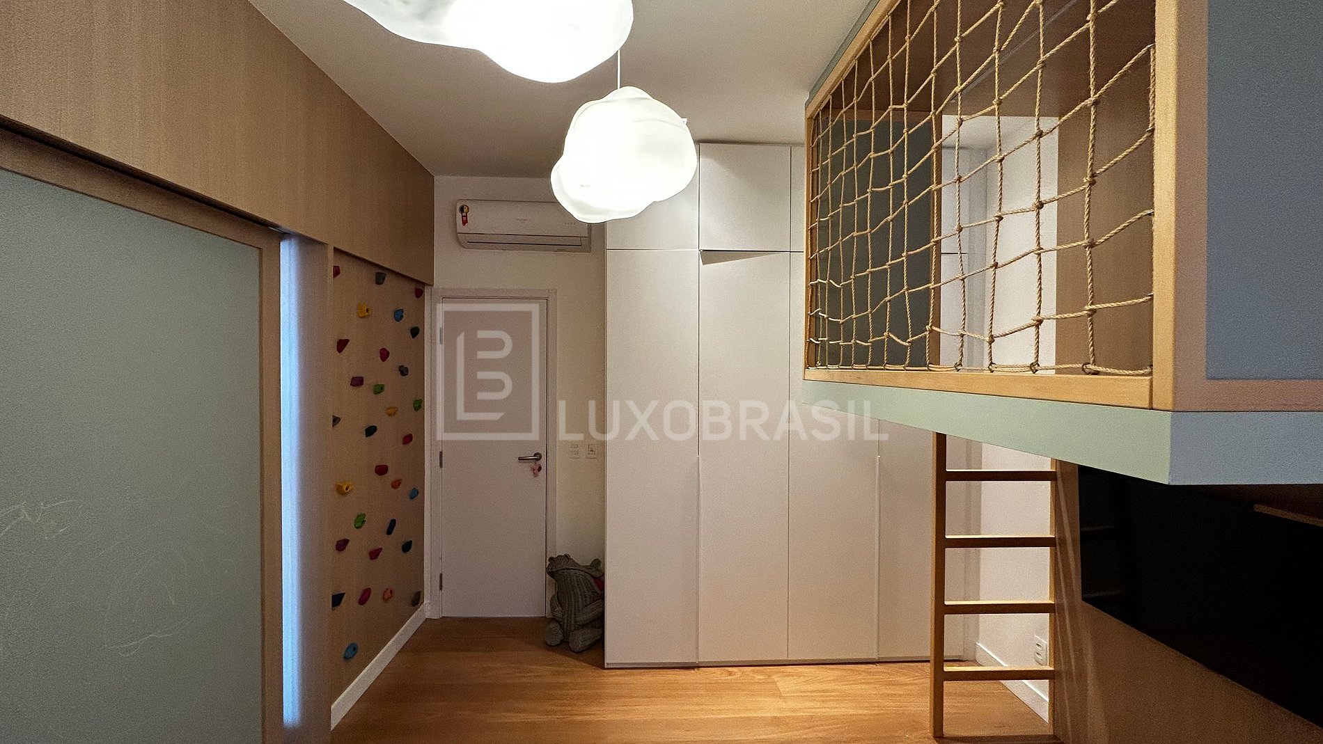 No primeiro andar, destaque para a ampla área social com sala em três ambientes (estar, jantar e TV), lavabo com bancada em Travertino Romano, cozinha estilo americana com armários planejados, área de serviço com lavanderia e dependência completa. São três quartos neste pavimento, incluindo a suíte máster com banheira e painel de TV giratório que garante privacidade e versatilidade. Os outros dois quartos podem ser transformados em uma ampla suíte com closet, graças à parede móvel que os conecta.