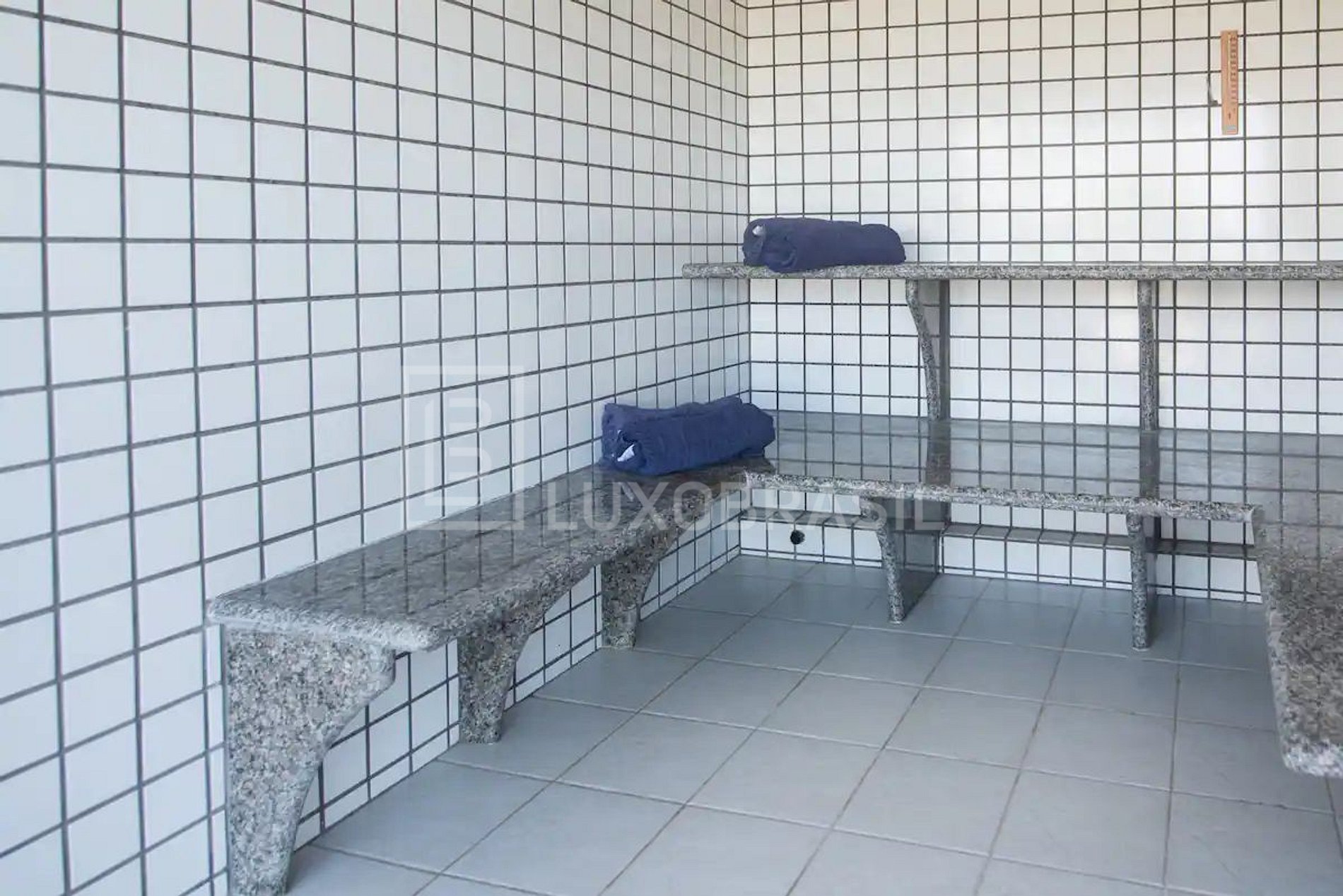 Área externa com piscina, churrasqueira a carvão, mesa externa para 14 pessoas, sauna, área do convés coberta com poltronas e área de jogos.